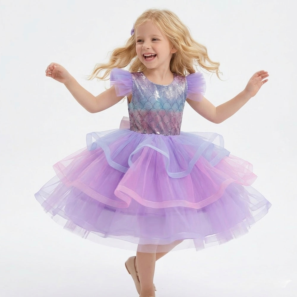 The perfect mermaid theme party dress available in sizes 2 up to size 7/8 and pairs perfectly with our stunning sequins kids capes are available in 5 different styles