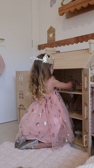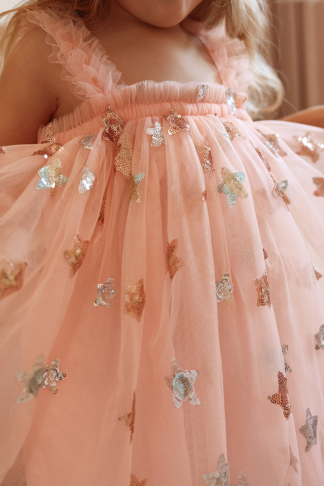 Make her day shine bright in our Pink Star Sparkle Tulle Party Dress – the sweetest outfit for birthdays, parties, and magical adventures. Designed in a dreamy pastel pink with layers of the softest tulle, this whimsical dress features glittering silver and rose-gold star appliqués that twinkle with every movement.