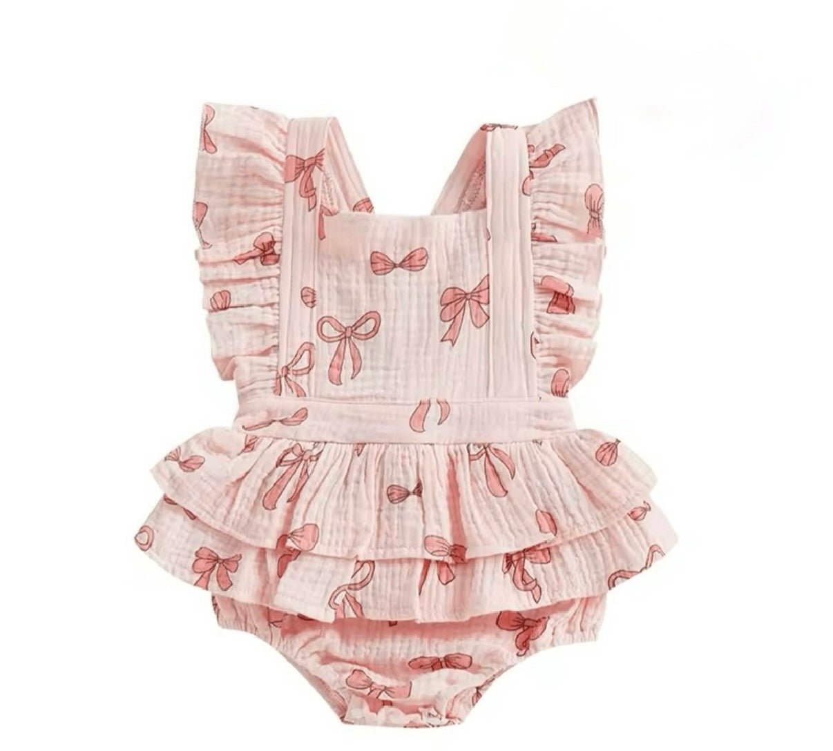 Special occasion baby pink cotton muslin fabric frill tutu romper with the sweetest little pink bow details all over the romper. It has 2 buttons at the back to do up and 3 snap buttons at the bottom of the romper for easy nappy changes.