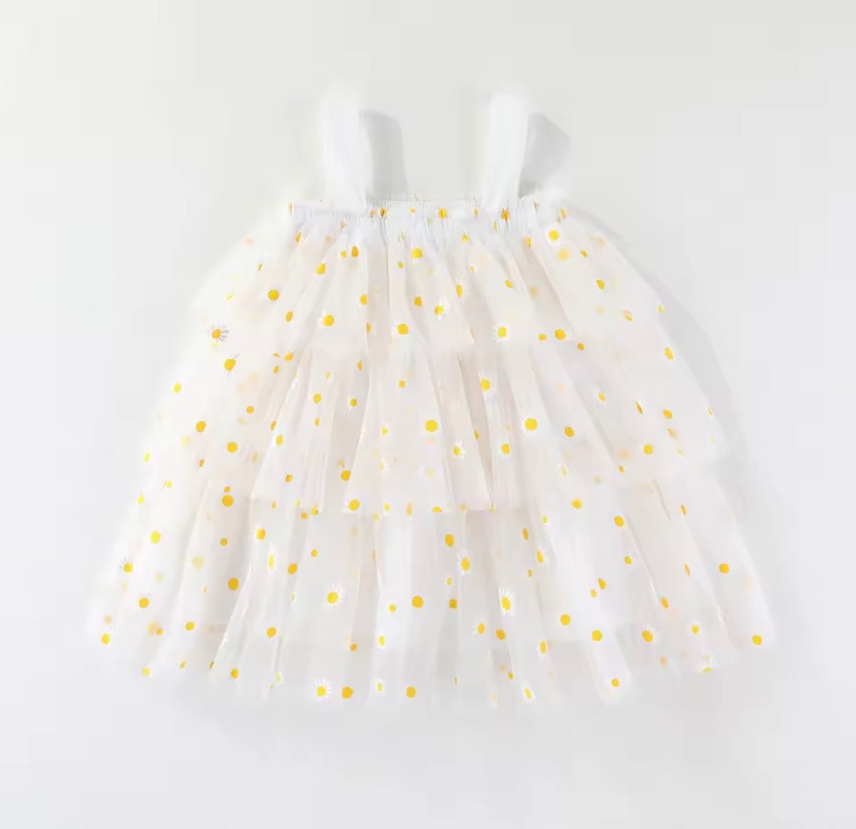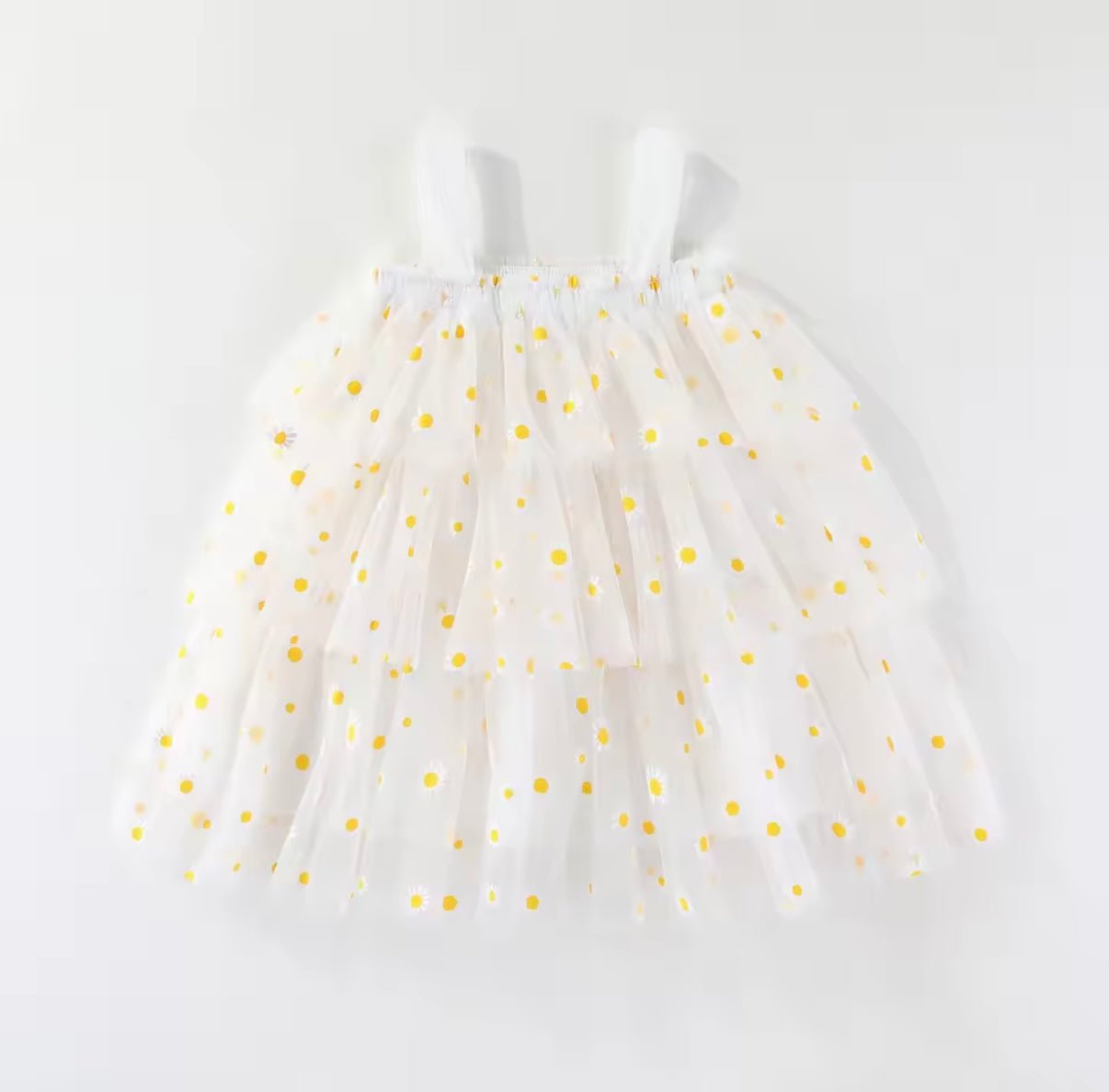 A dreamy garden delight! Our White Daisy Floral Tulle Dress is made for twirling through sunshine and smiles. Featuring layers of soft white tulle sprinkled with cheerful yellow daisies, this playful tutu dress is pure happiness. The stretchy waistband and shoulder straps ensure comfort for every little princess moment — from picnics and parties to photoshoots and playtime.