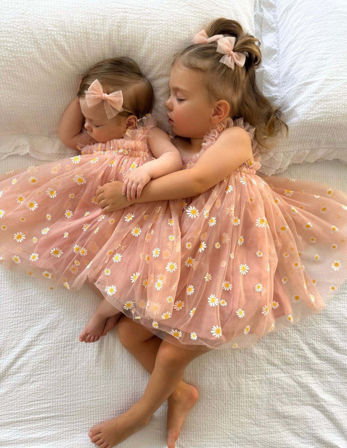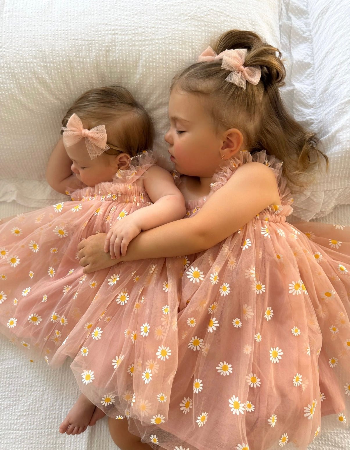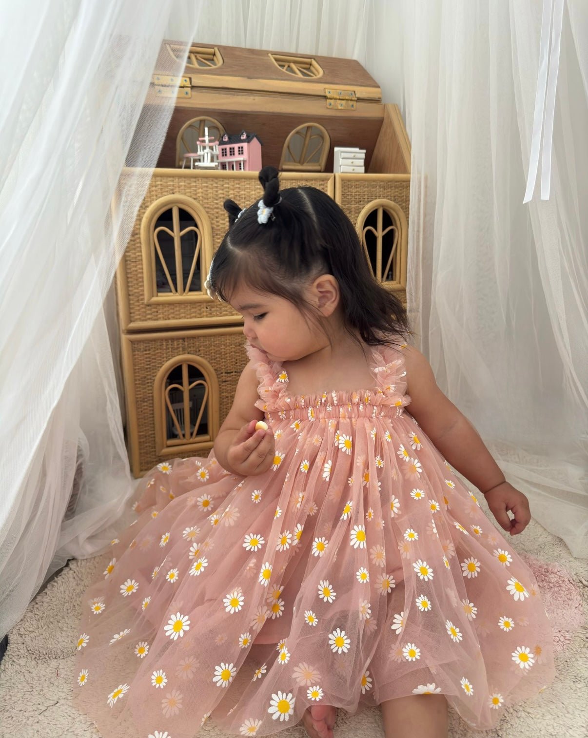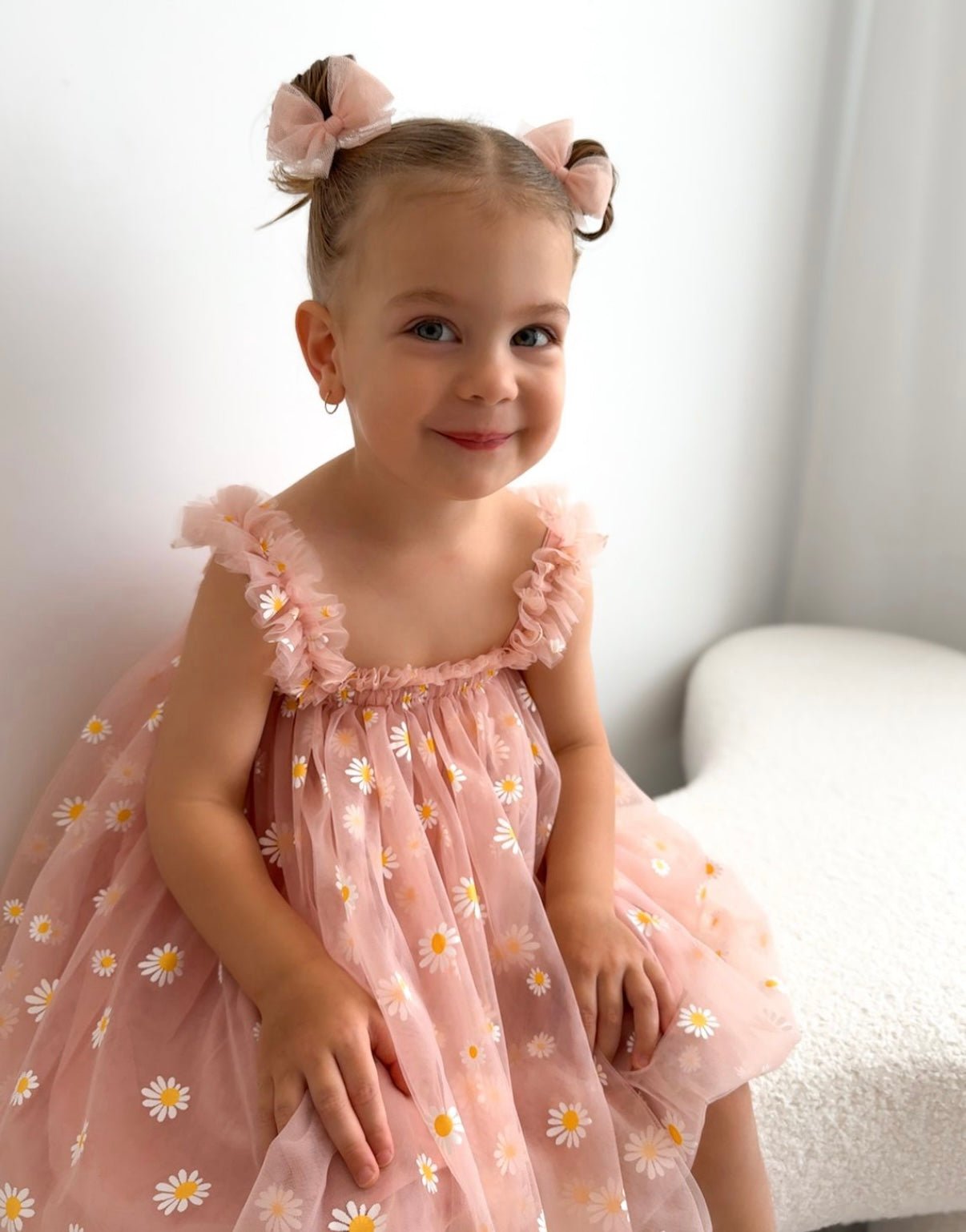 Gorgeous tulle blush pink tulle dress with yellow daisy details that is lined with a blush pink light cotton fabric perfect to wear on for a daisy themed birthday party or celebration.