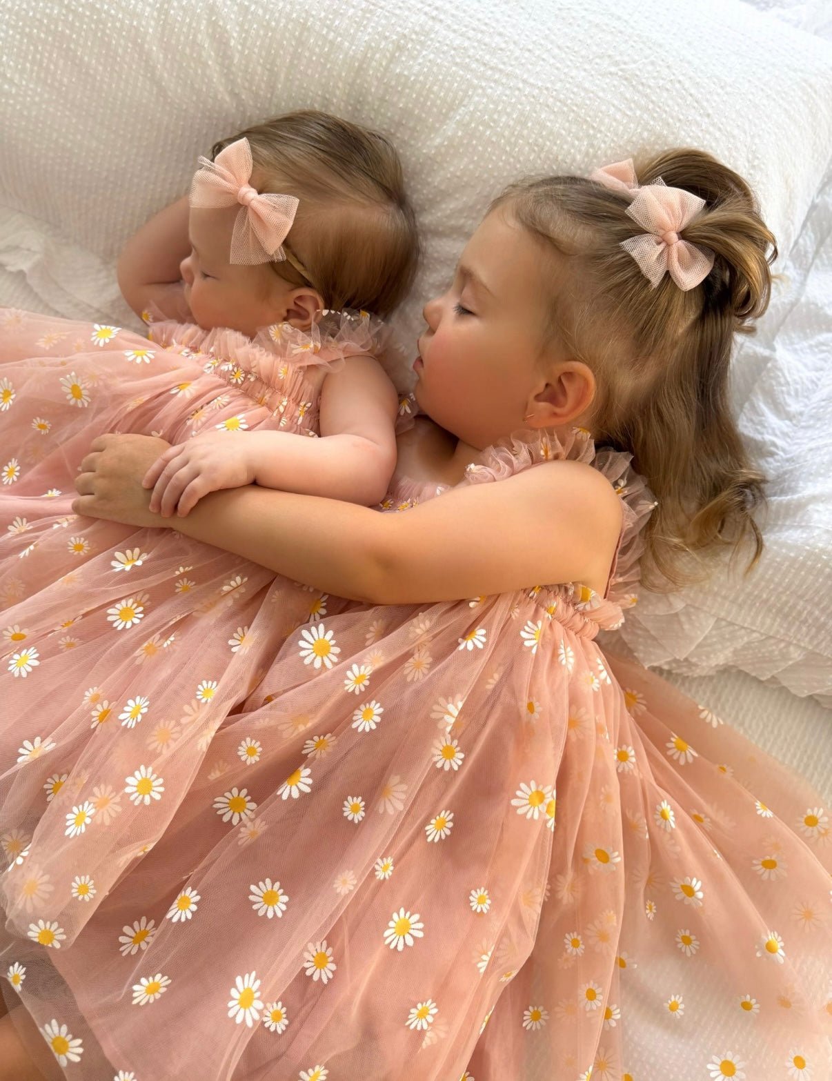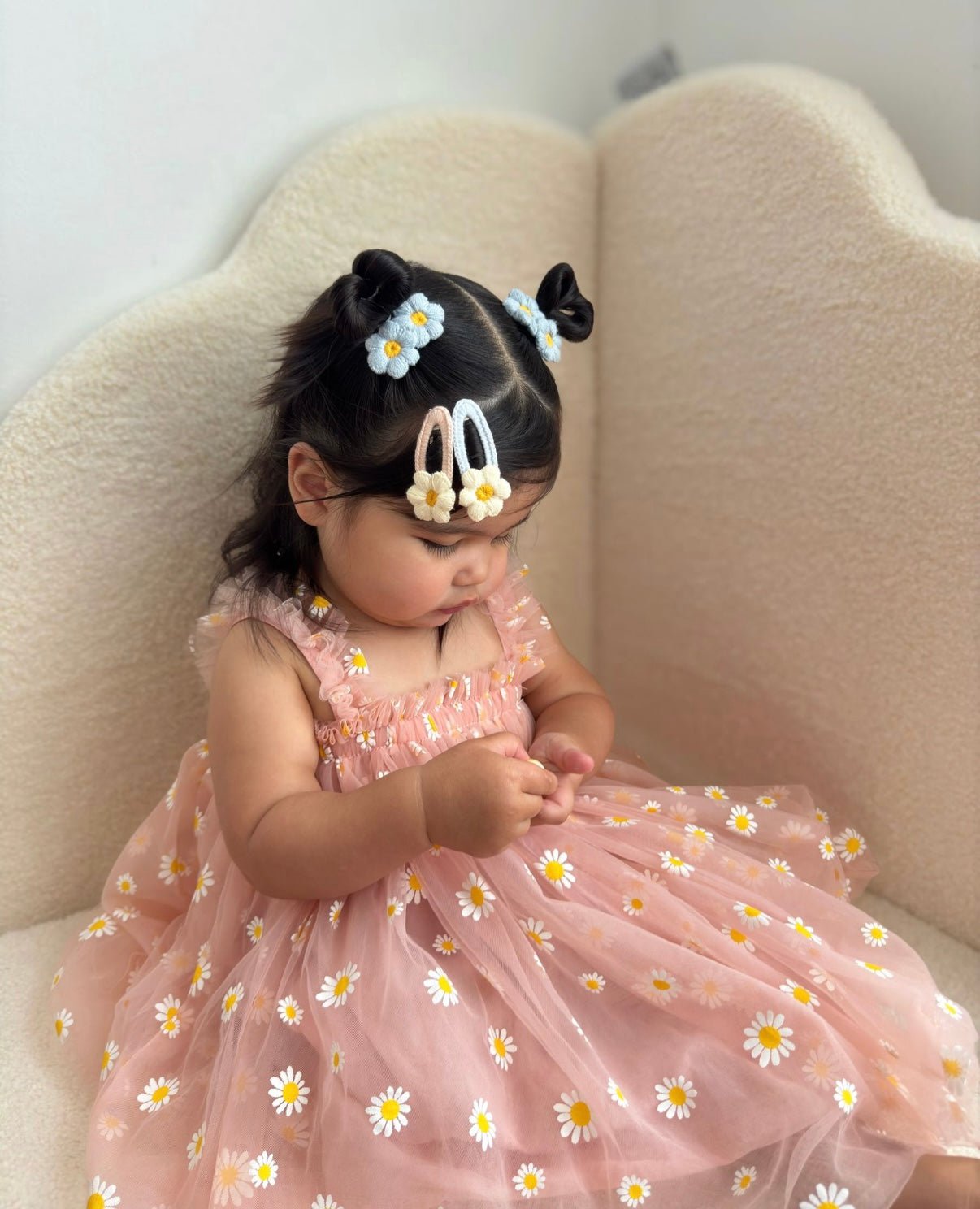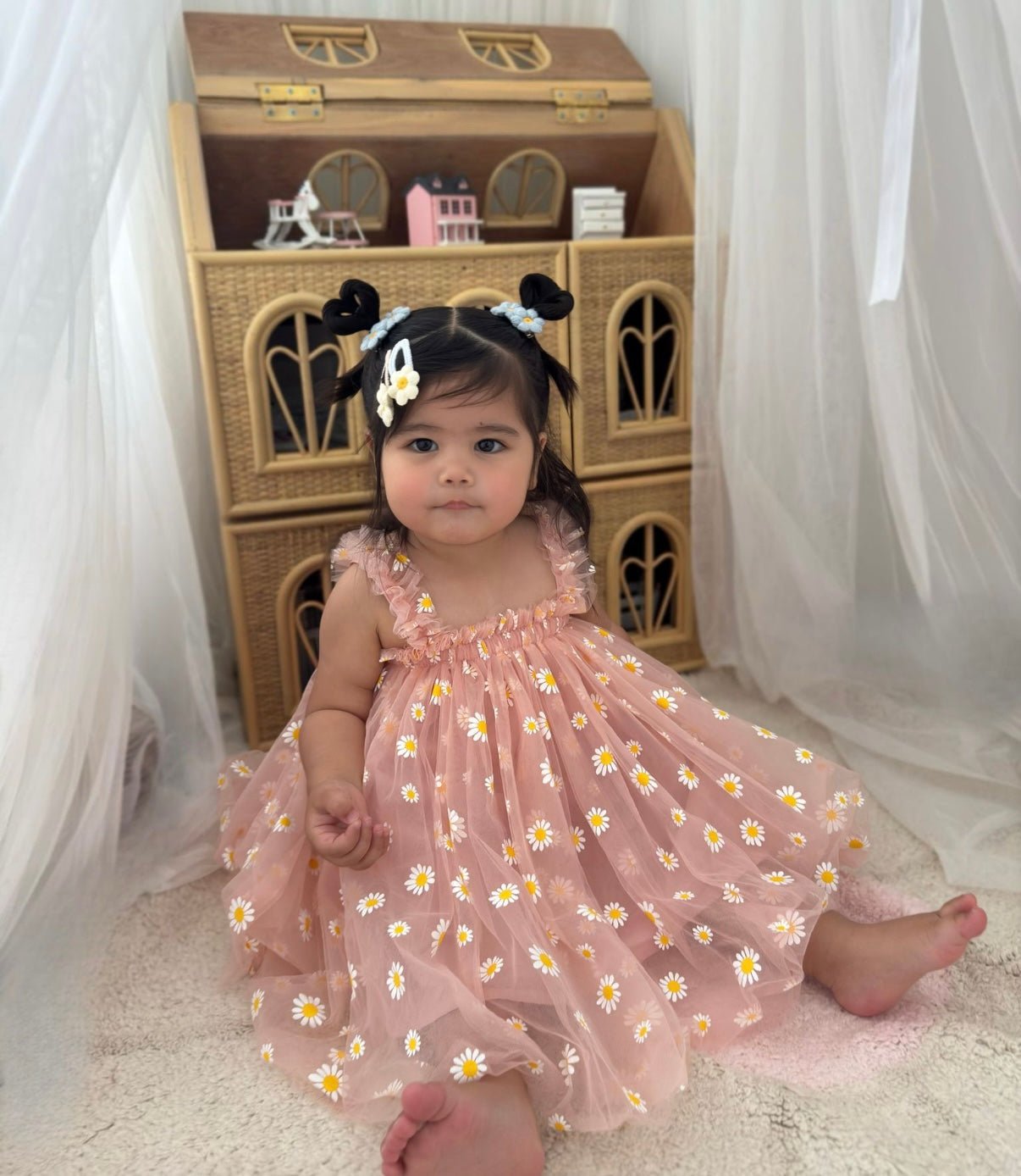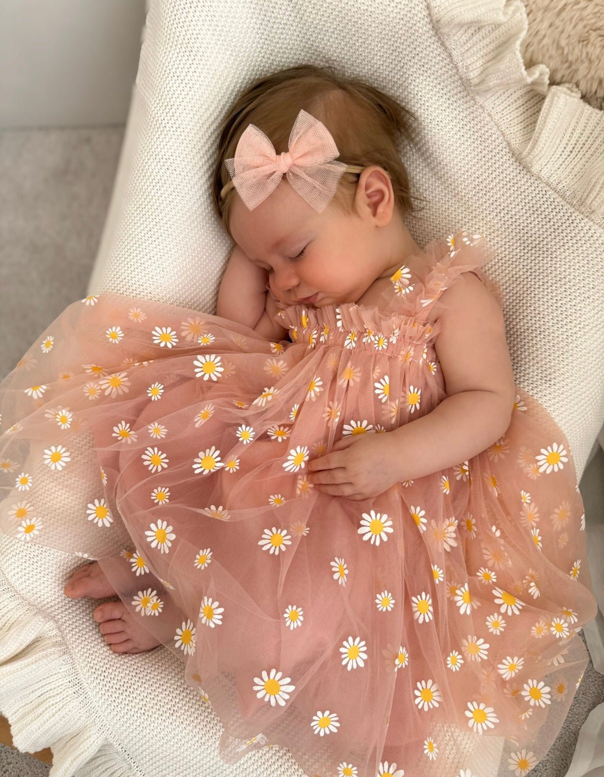 Gorgeous tulle blush pink tulle dress with yellow daisy details that is lined with a blush pink light cotton fabric perfect to wear on for a daisy themed birthday party or celebration.