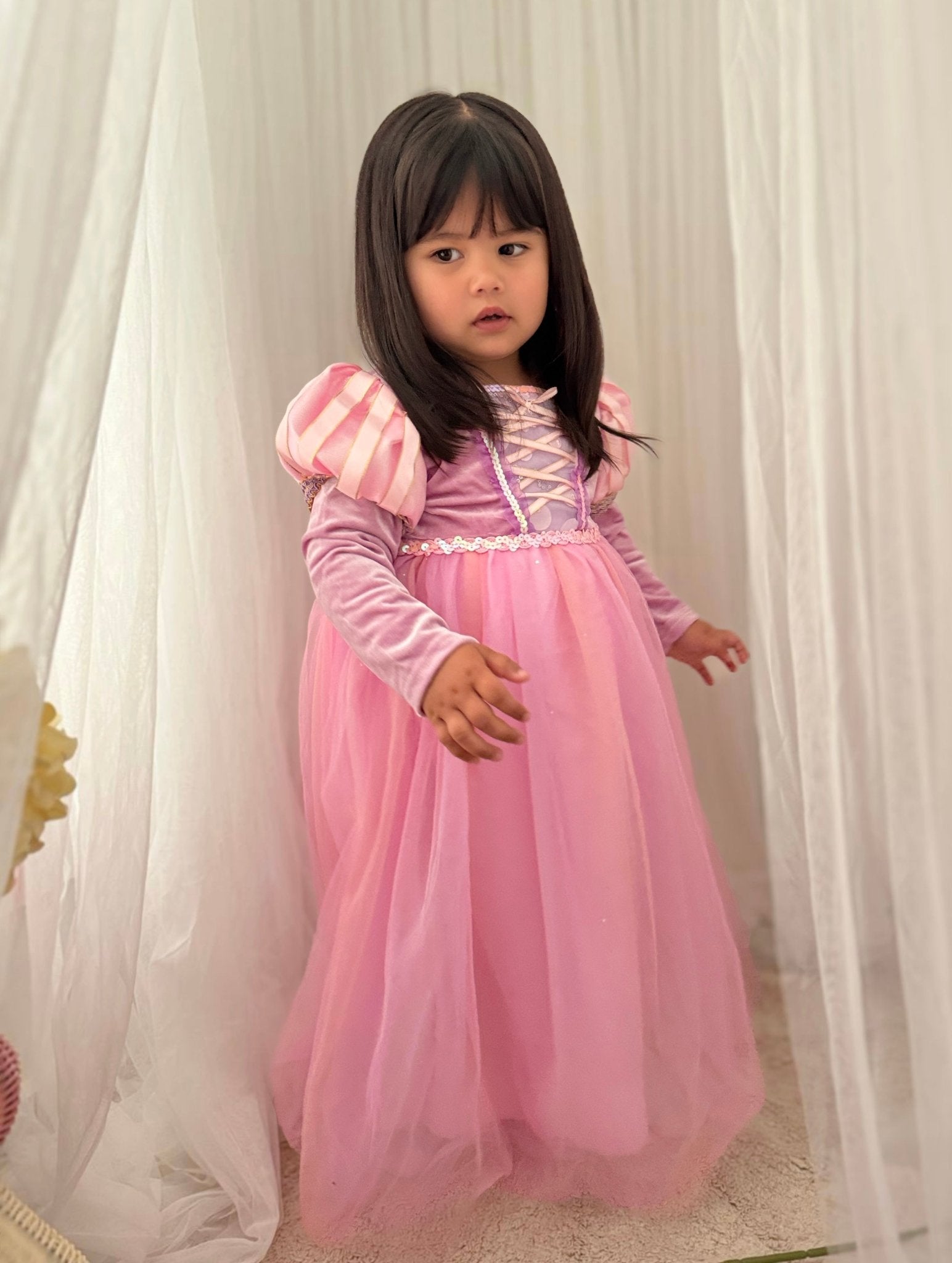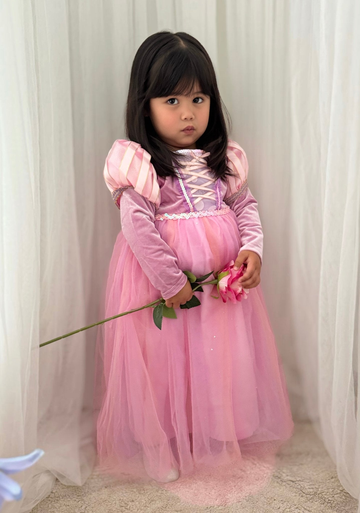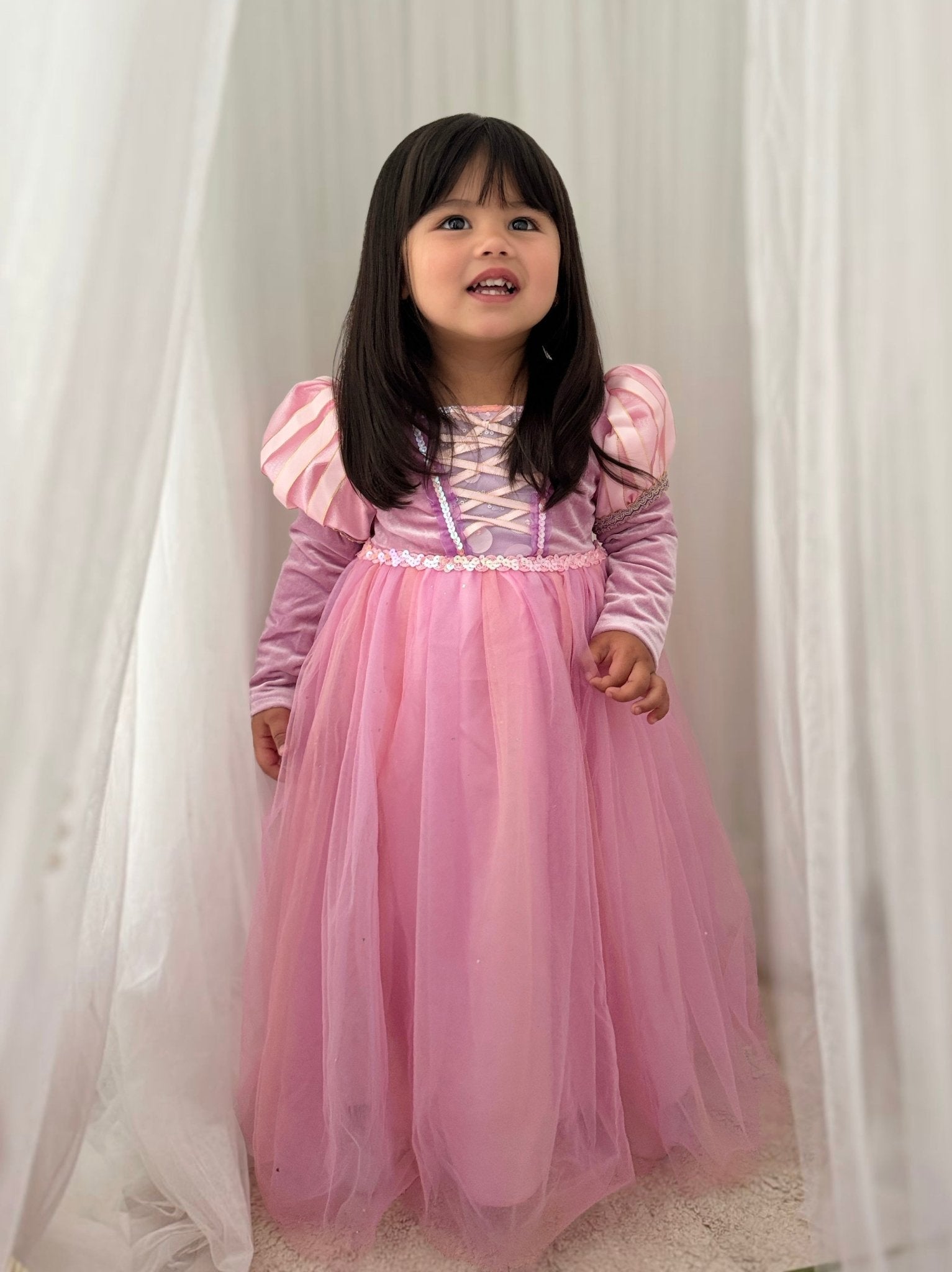 Bring her fairytale dreams to life with our stunning Rapunzel princess dress. Inspired by Tangled, this enchanting lilac gown features a velvet long sleeve bodice with sparkling sequin details, a shimmering gem centerpiece, and a flowing tulle skirt overlay for the perfect princess twirl.