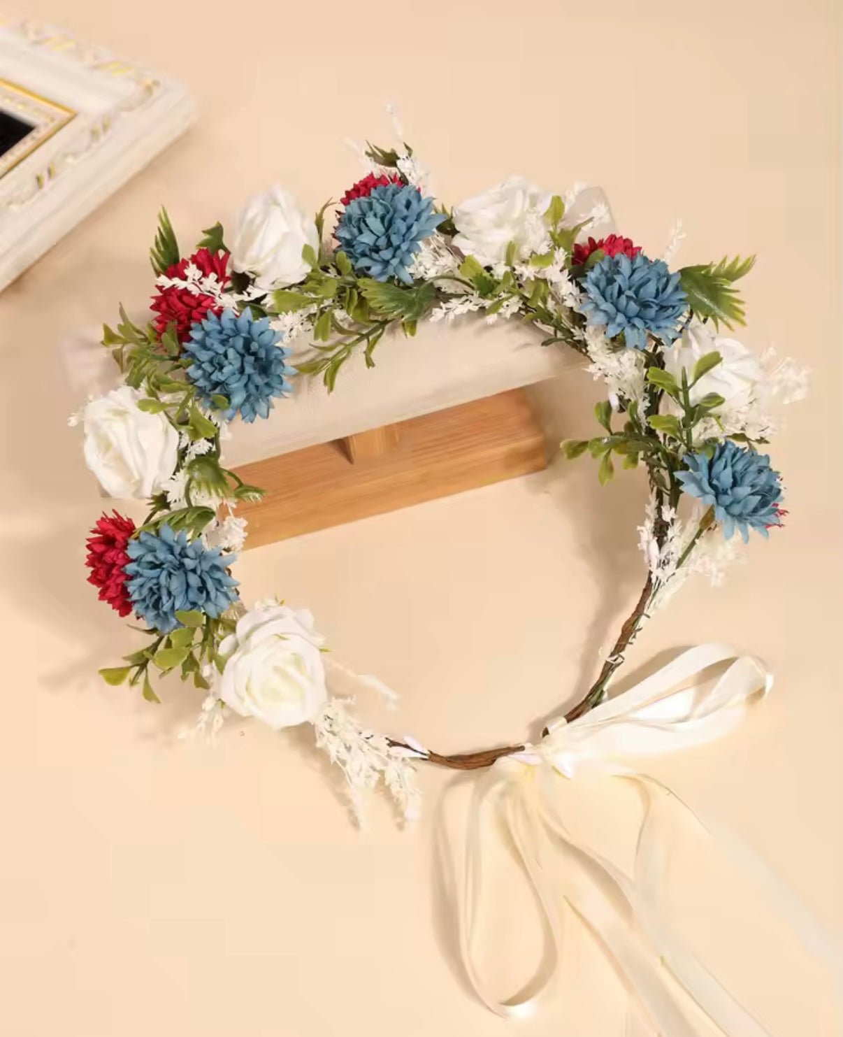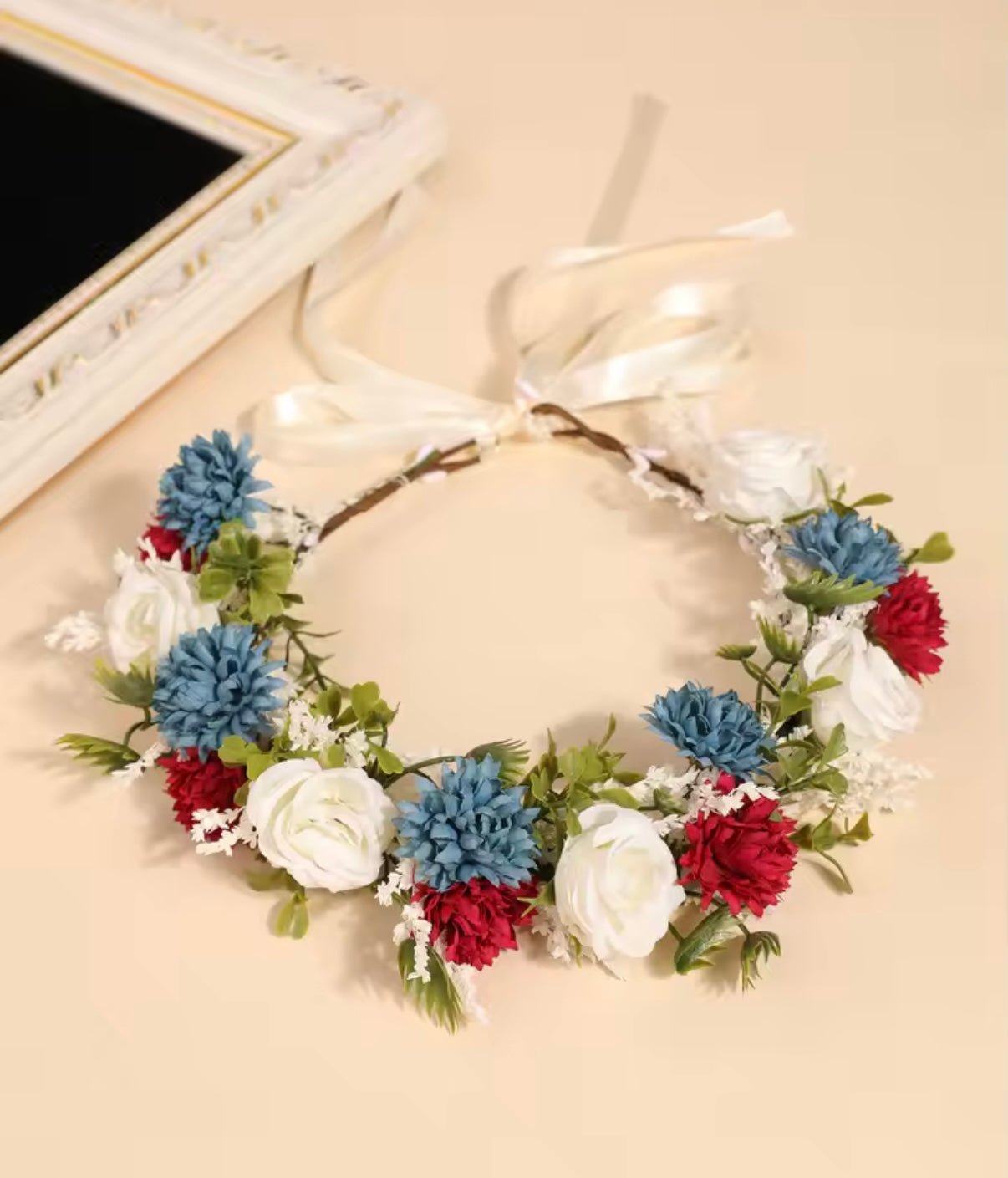 Beautiful ruby red, blue & white floral inspired flower head piece perfect for that special occasion like Christmas, birthday for your little girl. This stunning floral crown is one size fits all.