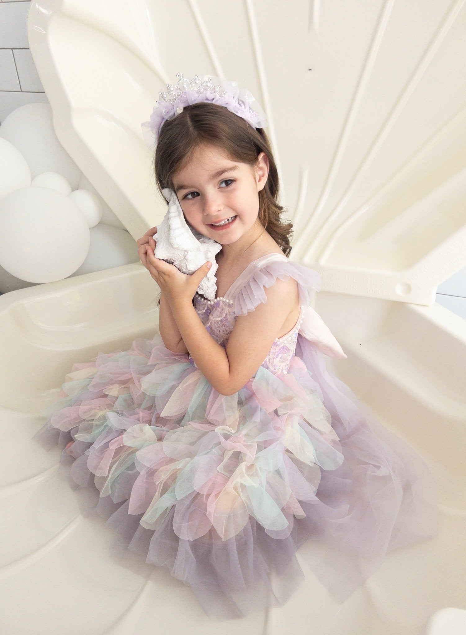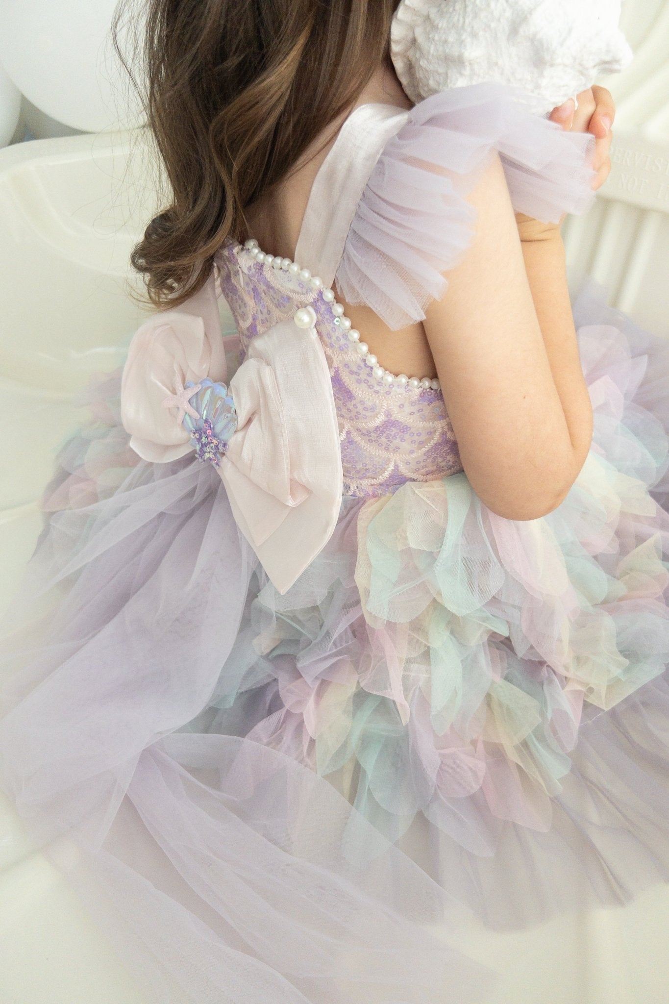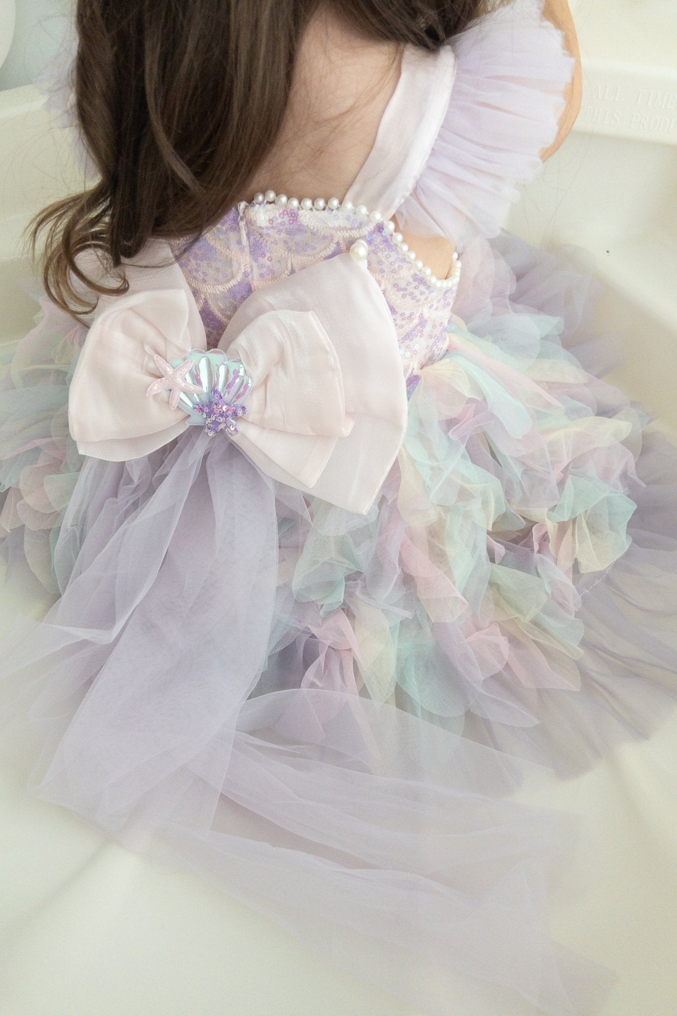 Make a splash! Our Mermaid Rainbow Bow Luxe Princess Dress shimmers with pastel magic—perfect for birthdays, photoshoots and every “under-the-sea” adventure.