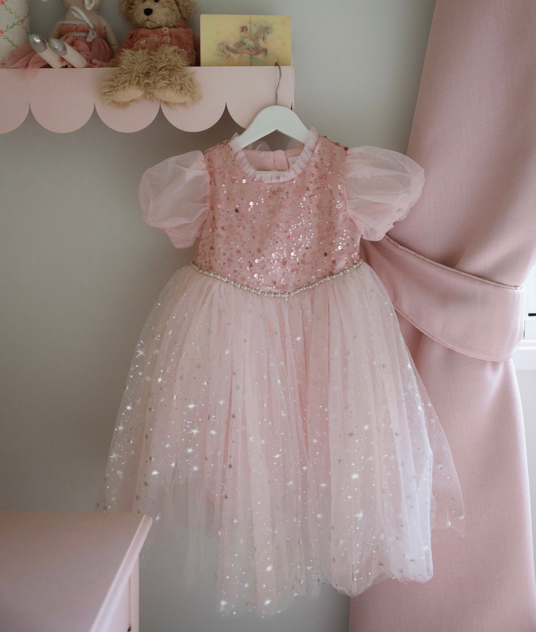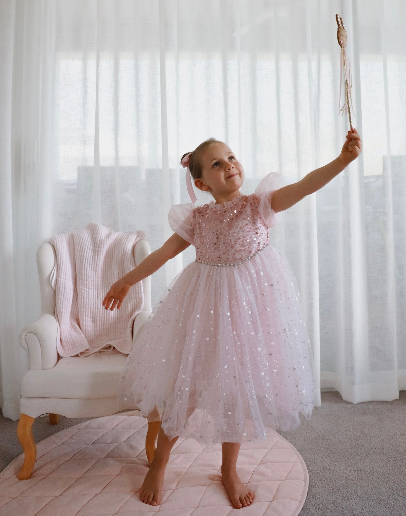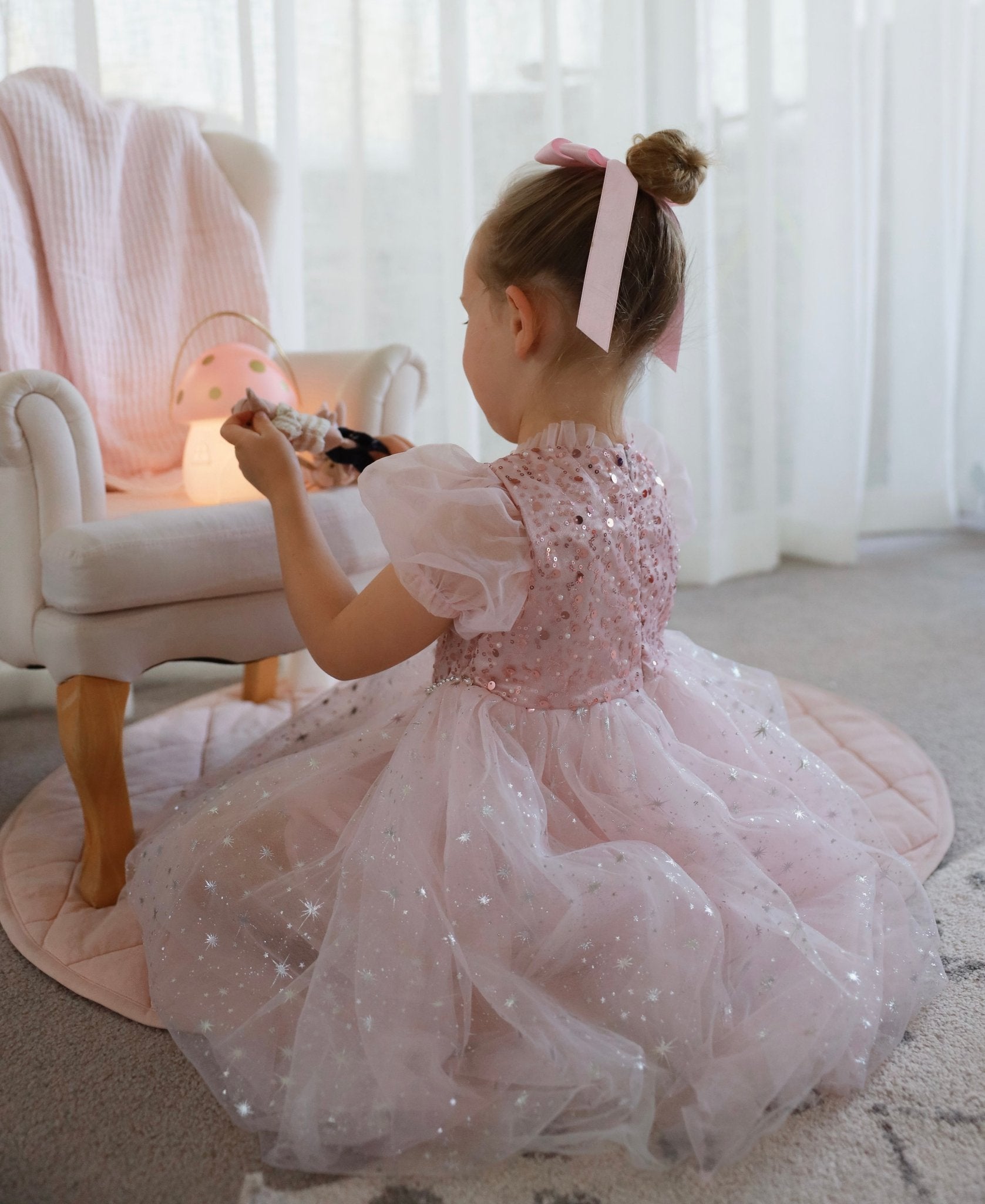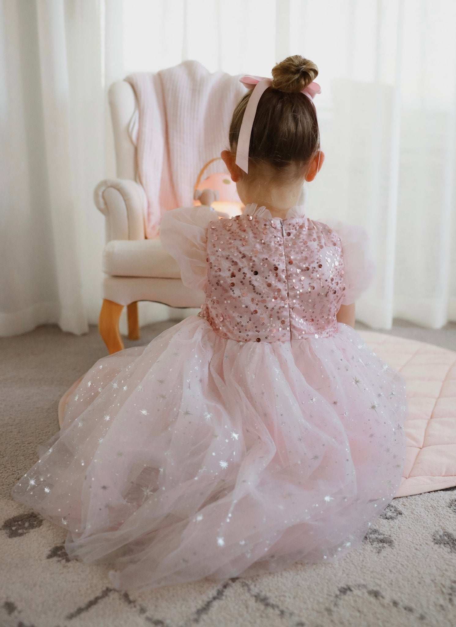 Let her shine like a true princess in our gorgeous Aurora inspired dress. Designed in a dreamy pink sparkle style, this enchanting gown features a sequin-detailed bodice, with layers of soft silk and tulle fabric for a magical, fairytale finish.