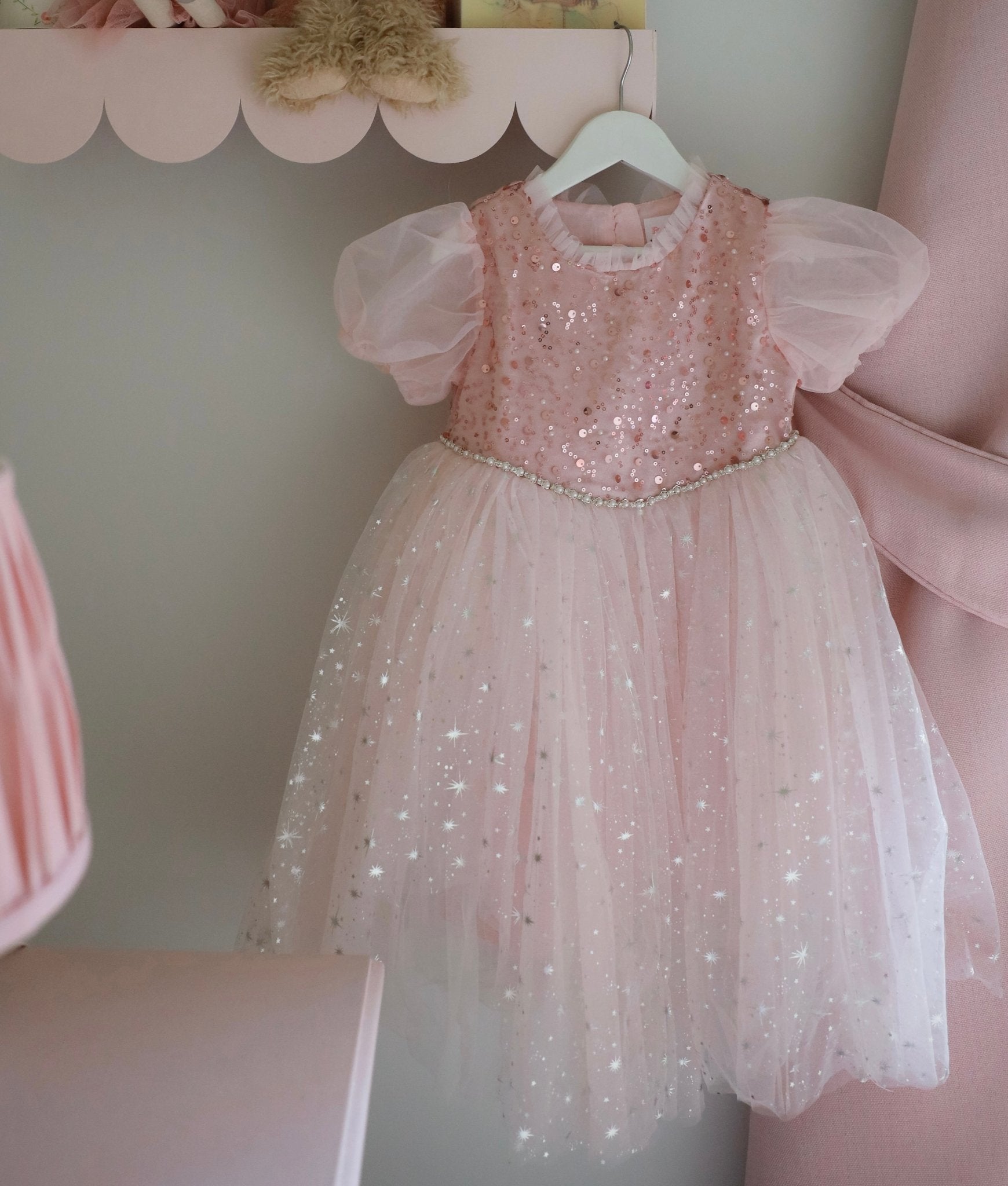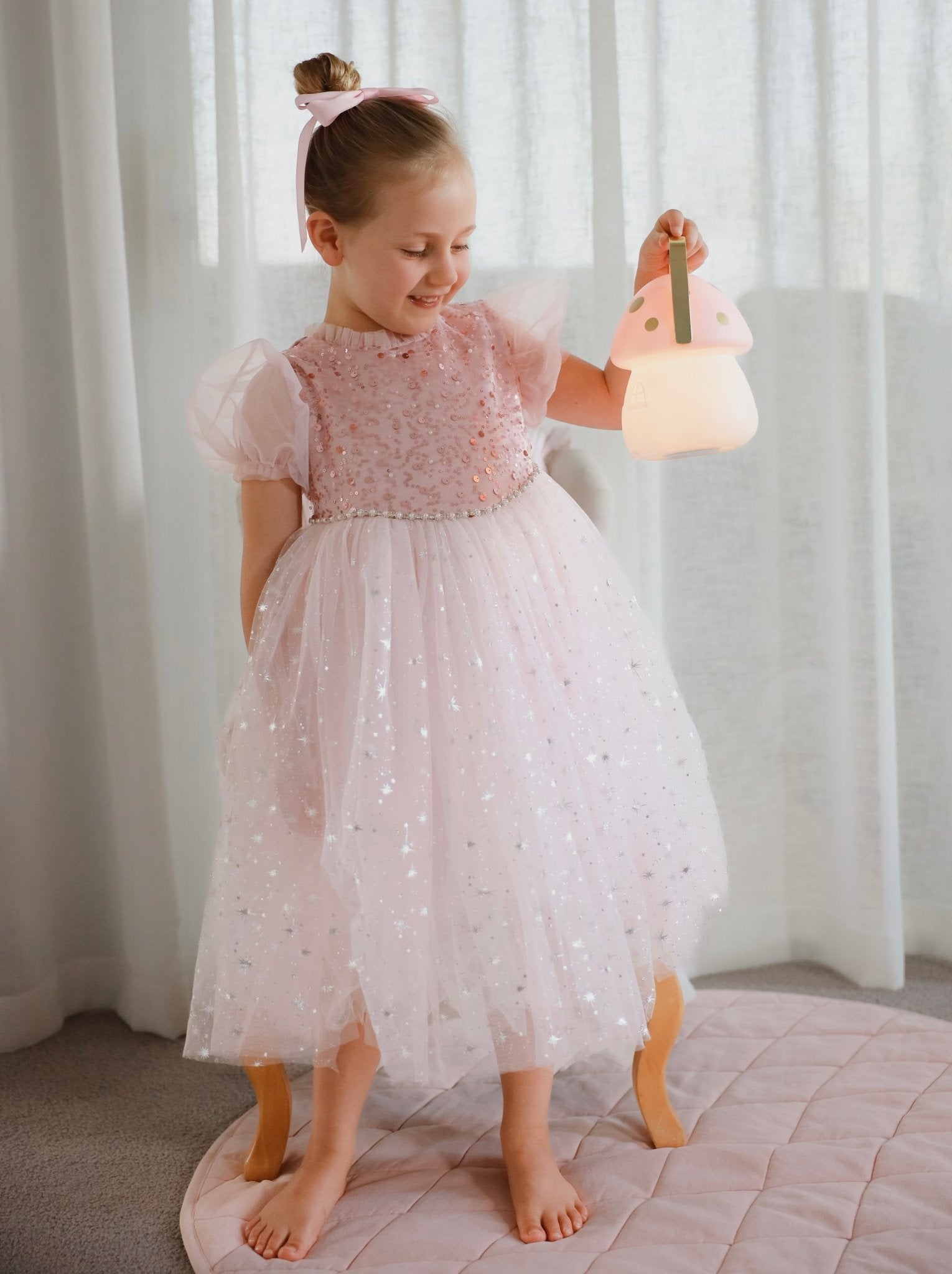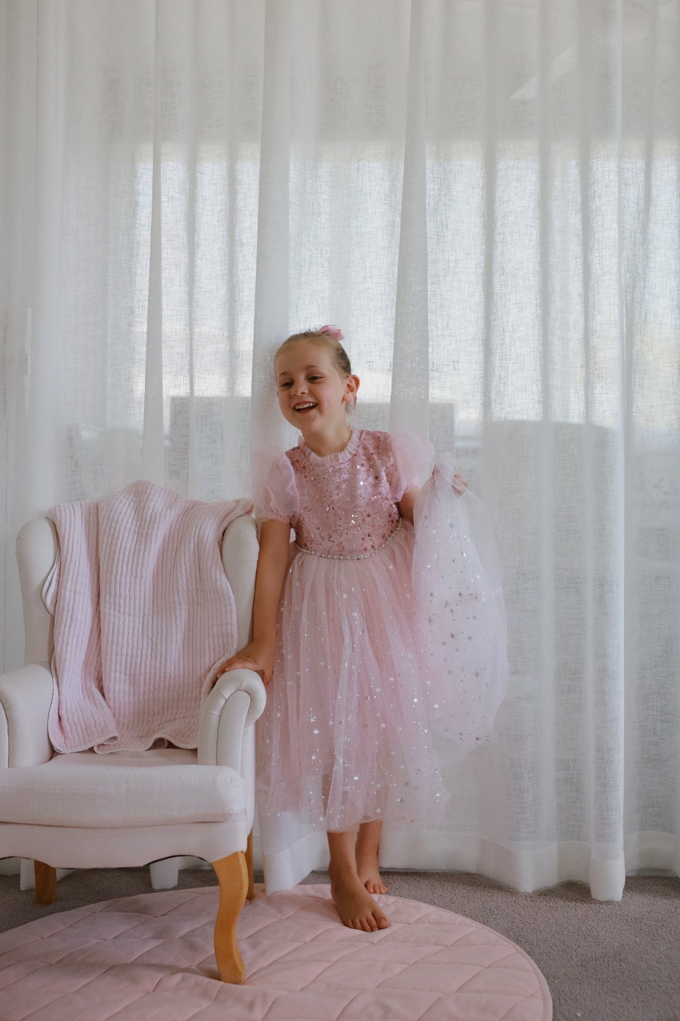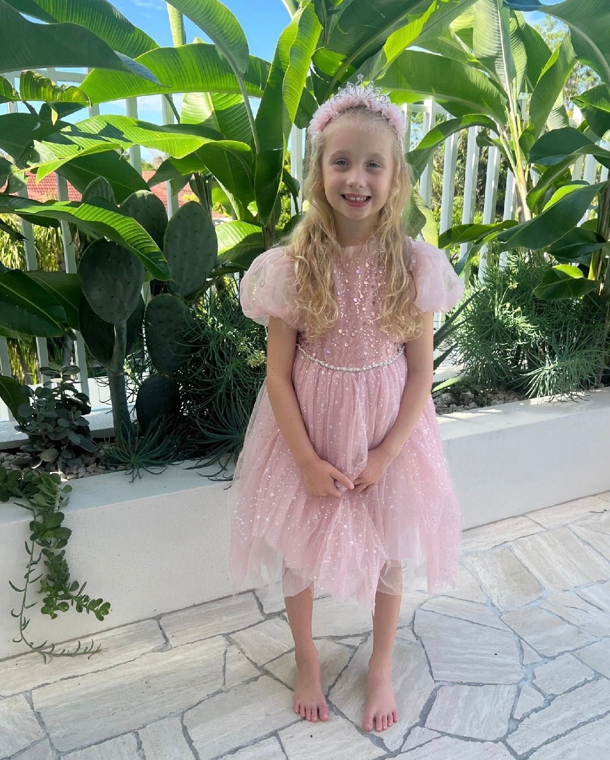 Let her shine like a true princess in our gorgeous Aurora inspired dress. Designed in a dreamy pink sparkle style, this enchanting gown features a sequin-detailed bodice, with layers of soft silk and tulle fabric for a magical, fairytale finish.