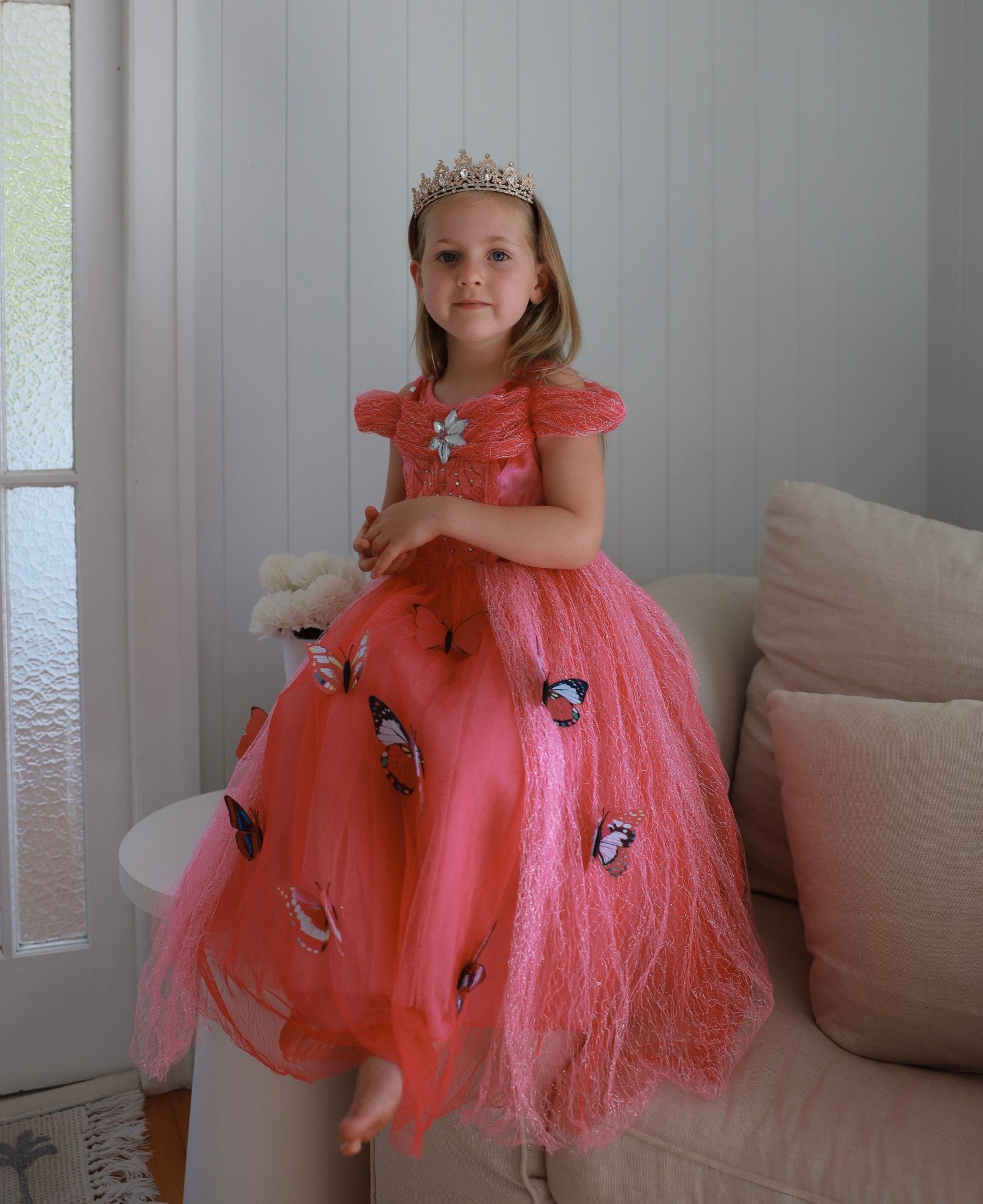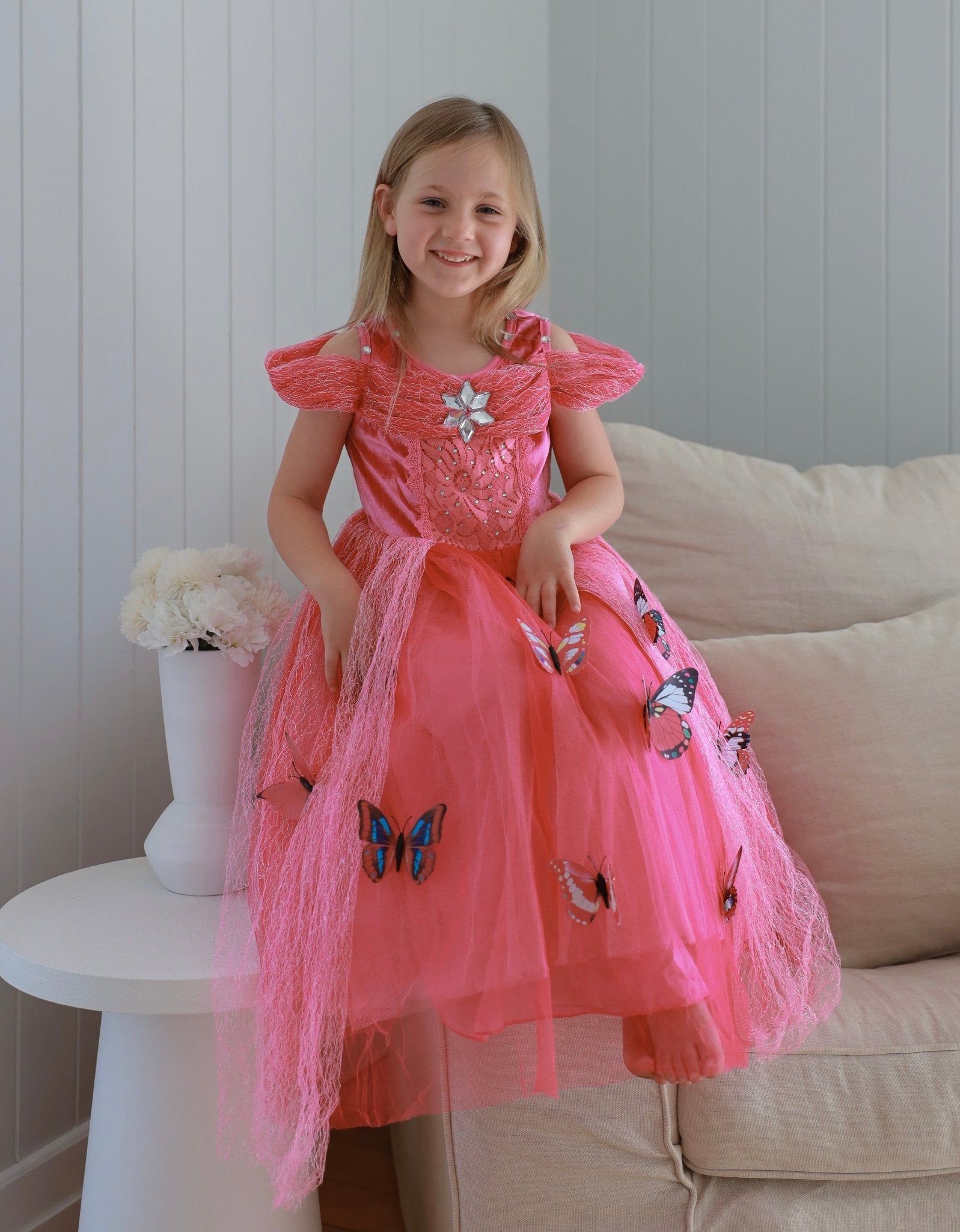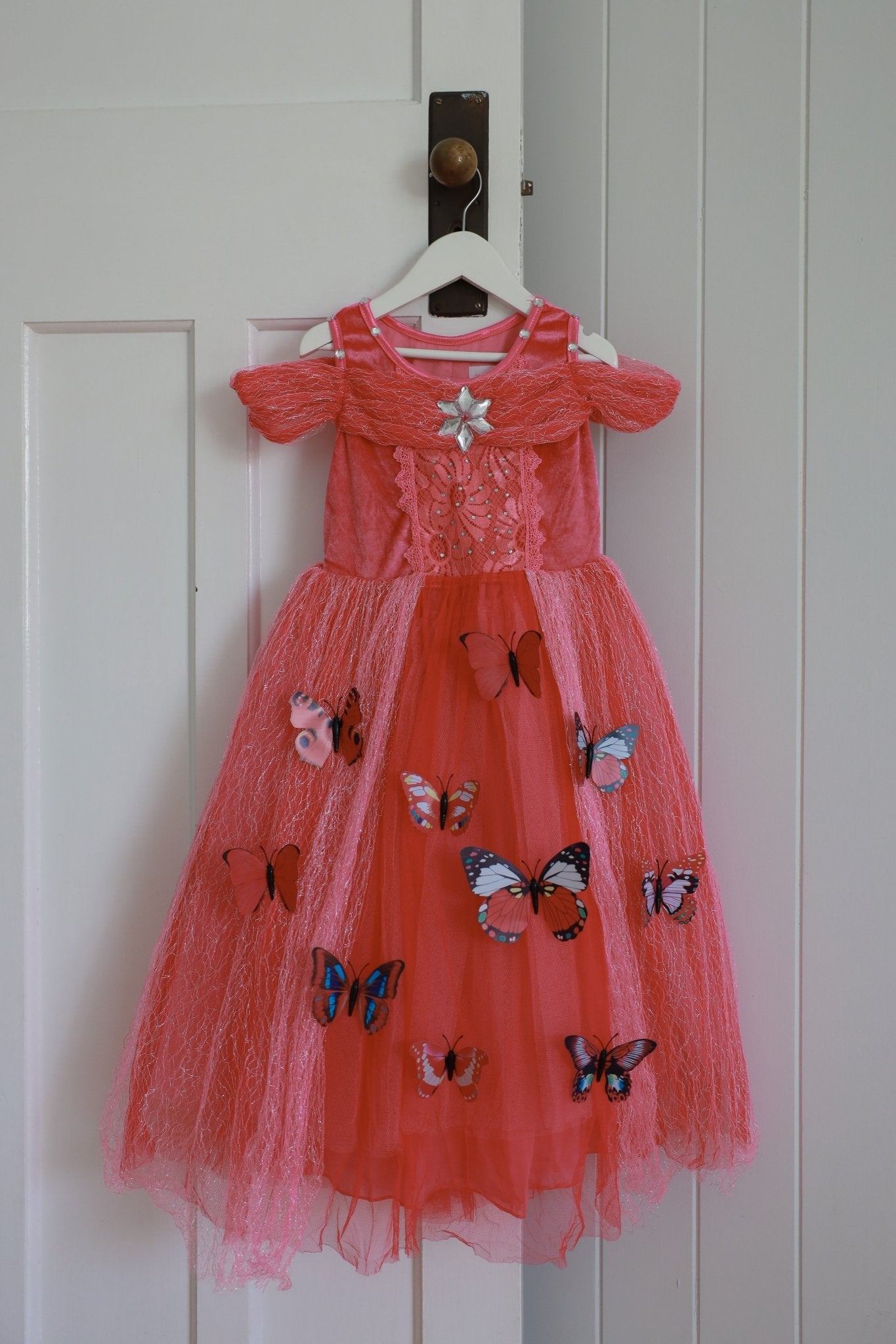 Gorgeous pretty in pink aurora style princess birthday theme party dress is a beautiful unique dress with gem detail at the front and tulle sleeve detail with a soft pink velvet stretch fabric on the top part with a tulle overlay and has butterfly to clip on yourself and place where you would like them to go with matching 6 pieces jewellery set & glove set.
