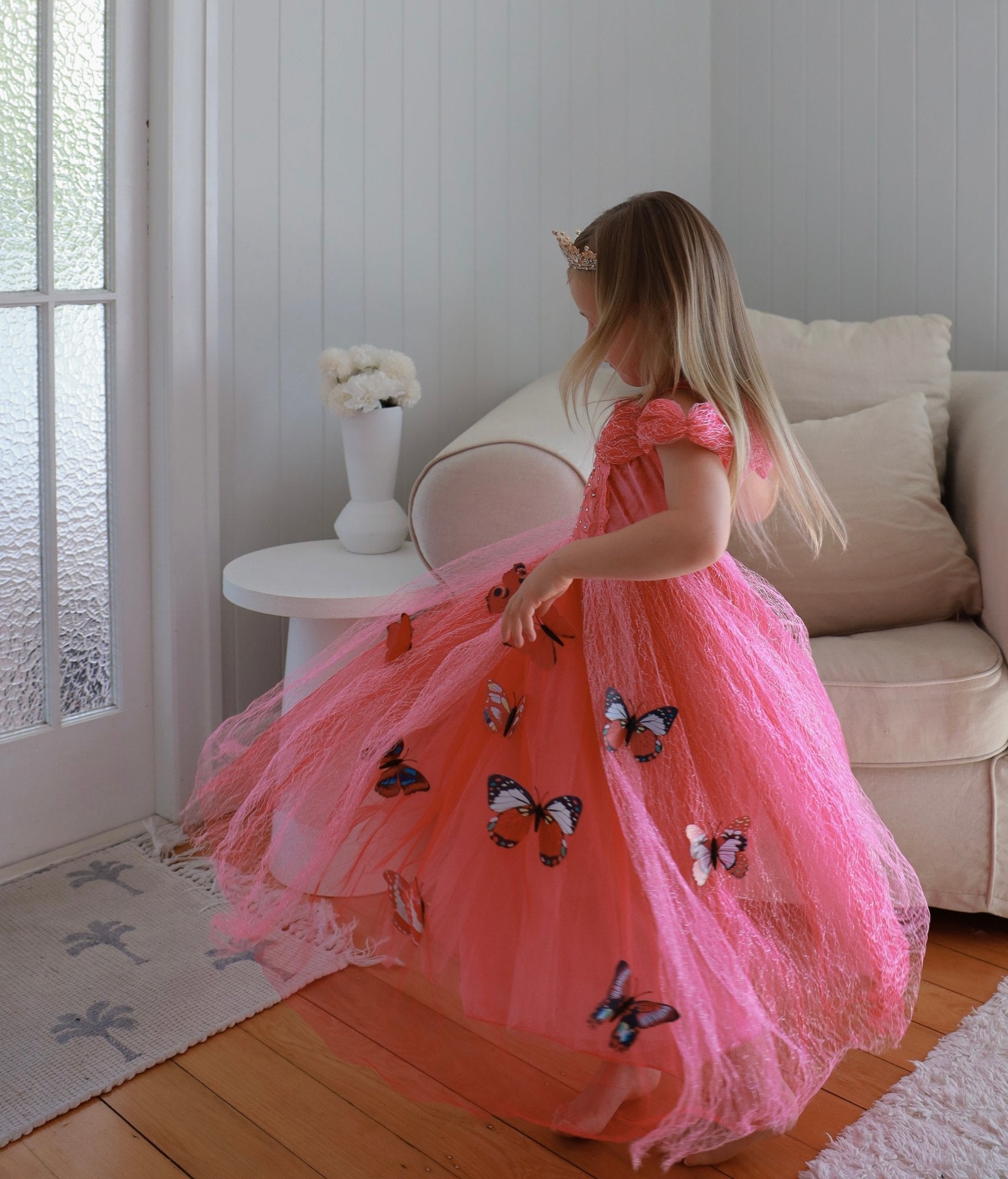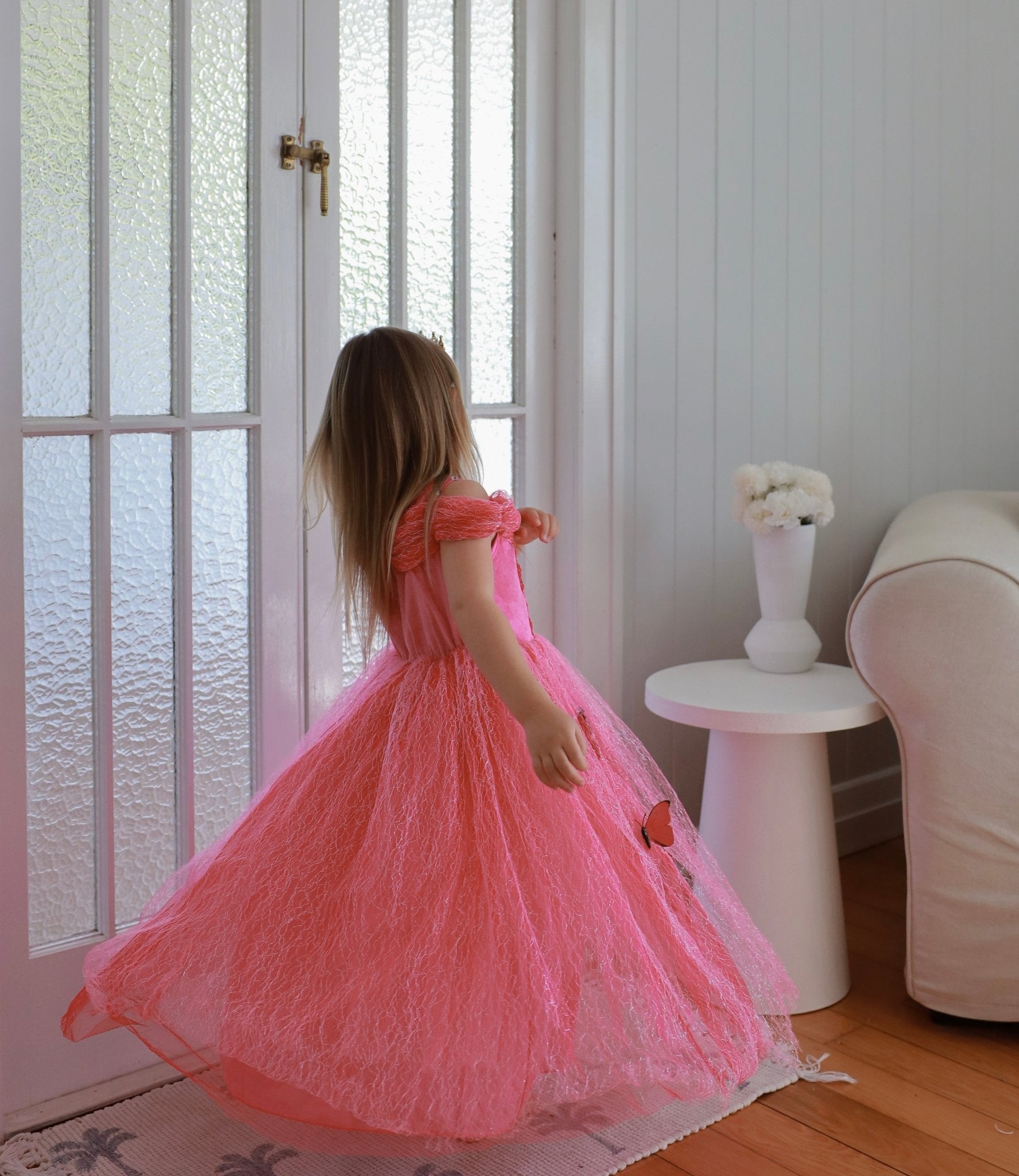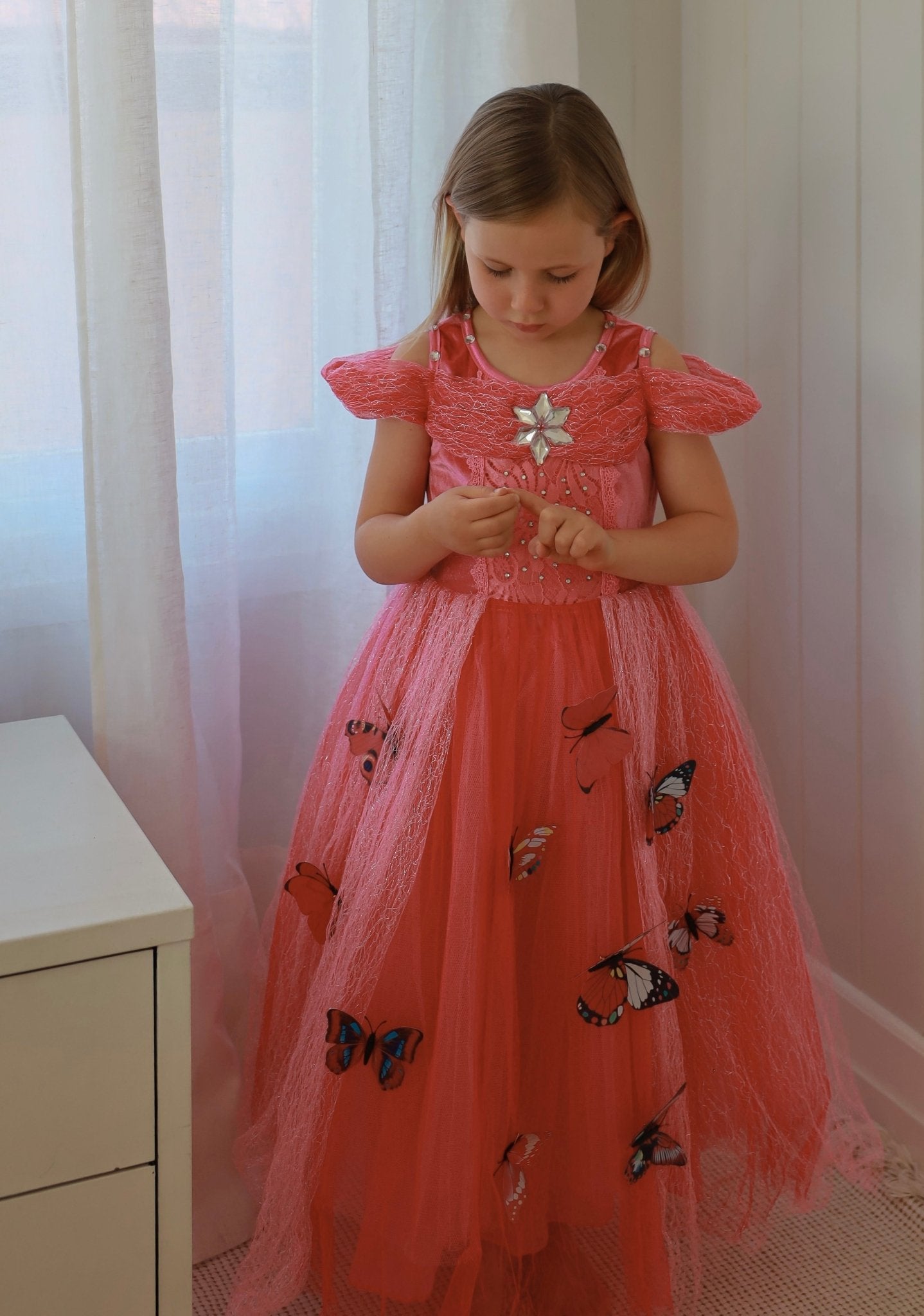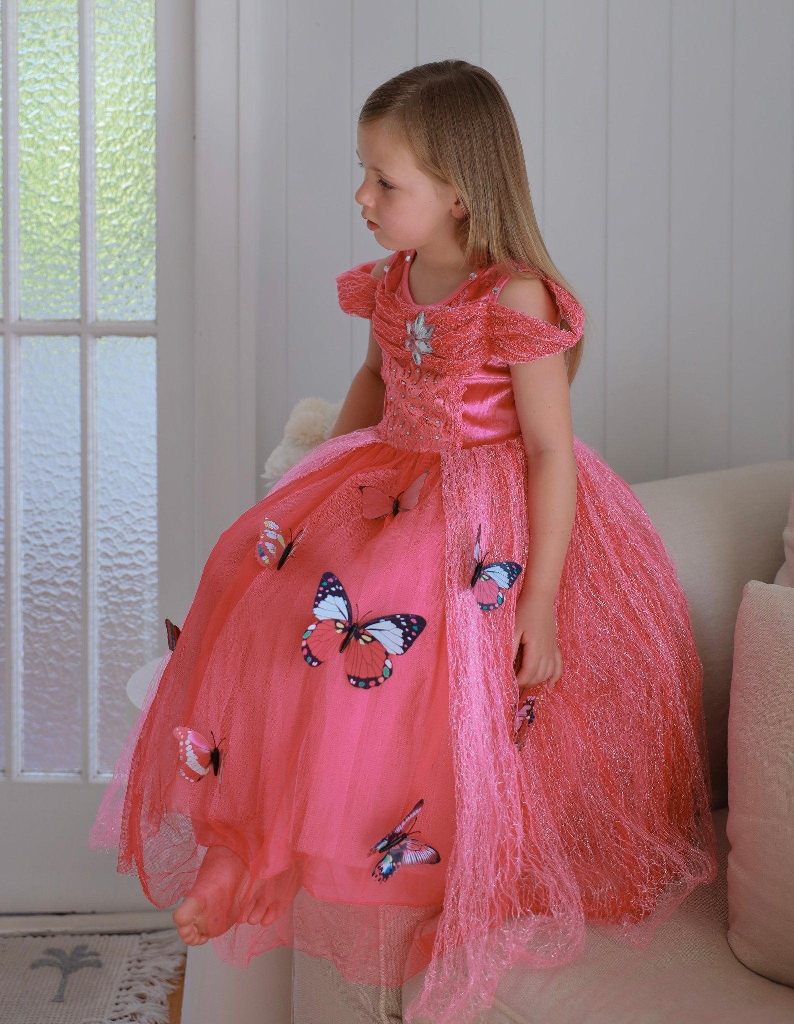 Gorgeous pretty in pink aurora style princess birthday theme party dress is a beautiful unique dress with gem detail at the front and tulle sleeve detail with a soft pink velvet stretch fabric on the top part with a tulle overlay and has butterfly to clip on yourself and place where you would like them to go with matching 6 pieces jewellery set & glove set.