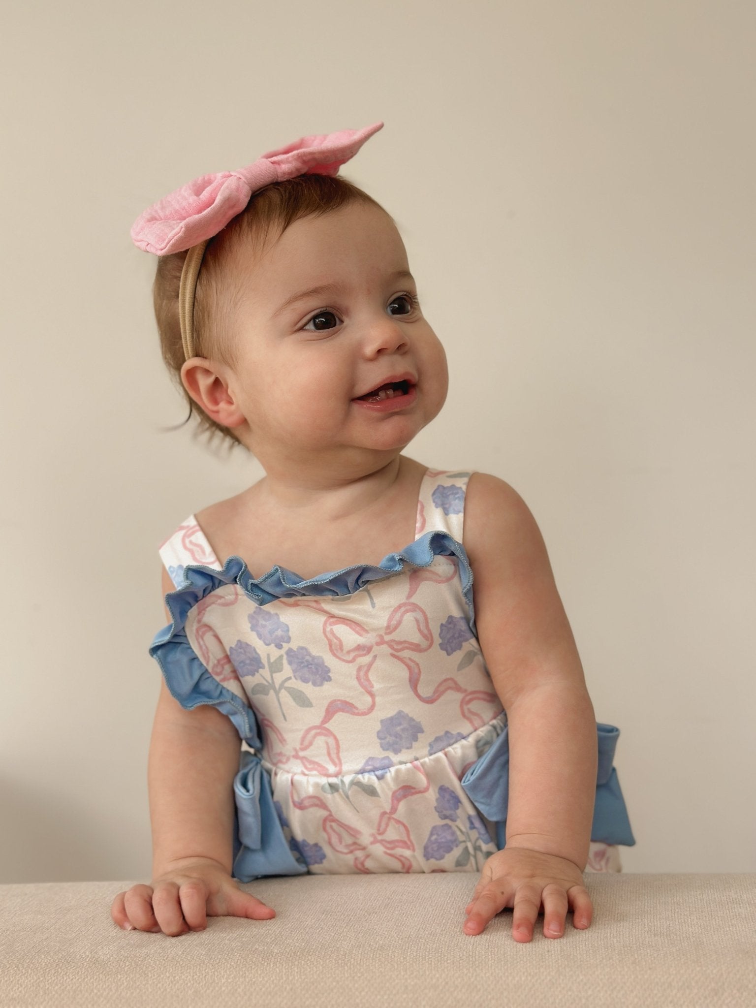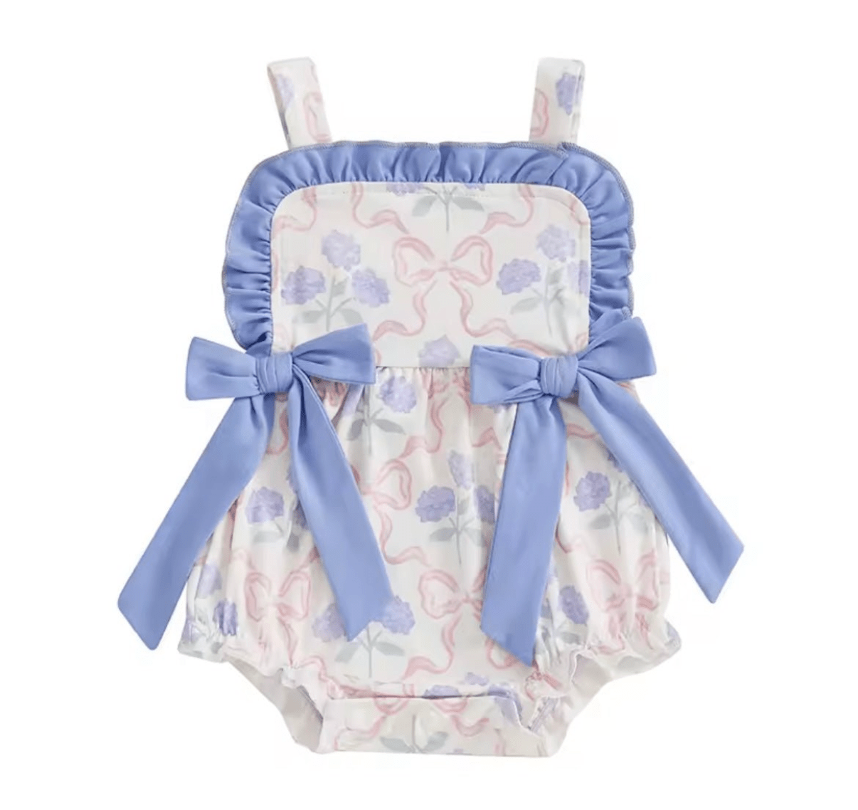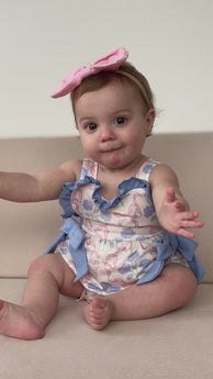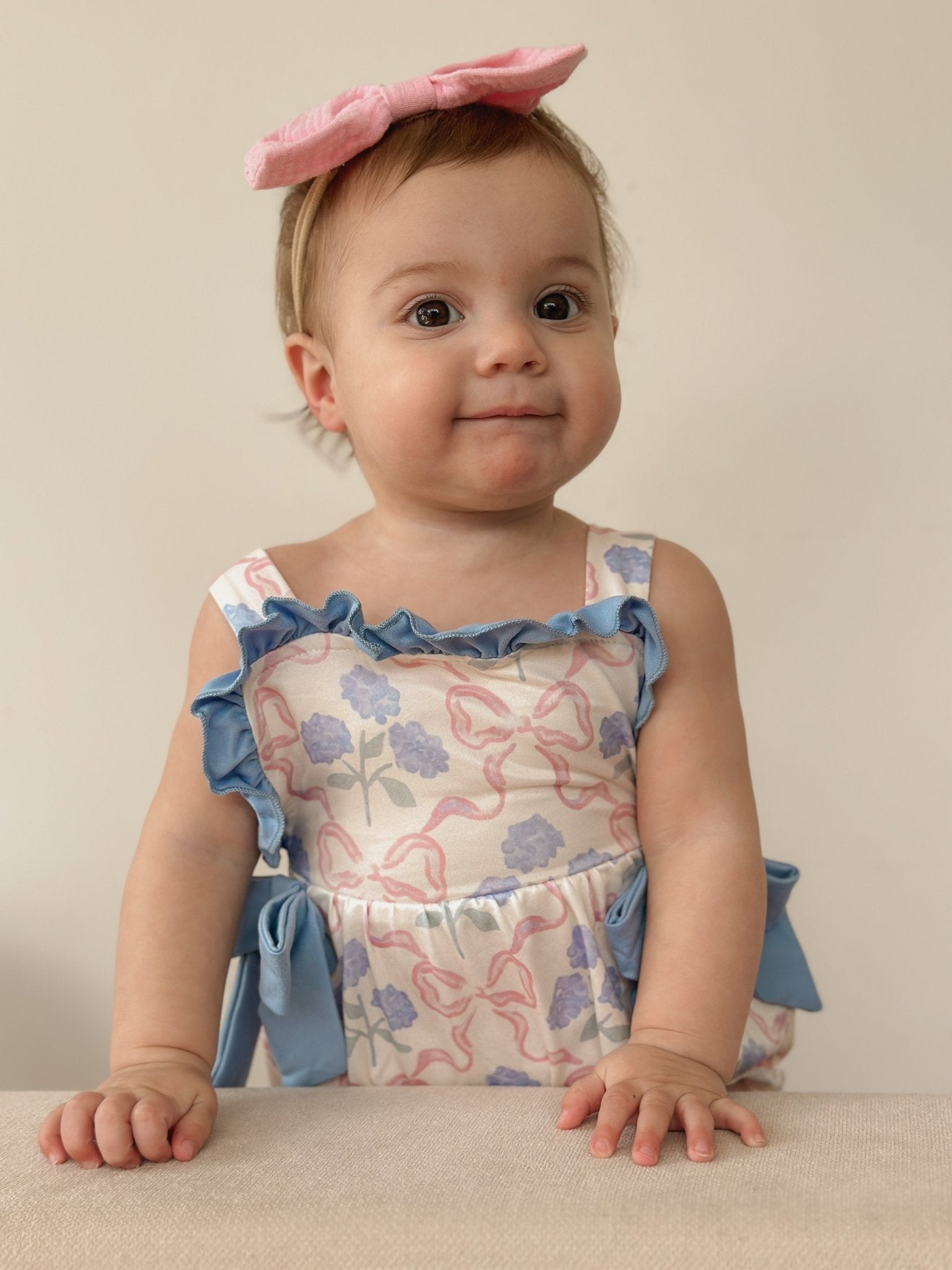 Special occasion soft jersey cotton fabric baby girl romper with the sweetest floral and pink bow detail on the fabric with 2 statement blue bows and blue frill detail and has 3 buttons at the bottom for easy nappy changes and 2 adjustable buttons to adjust for the best fit on the straps.