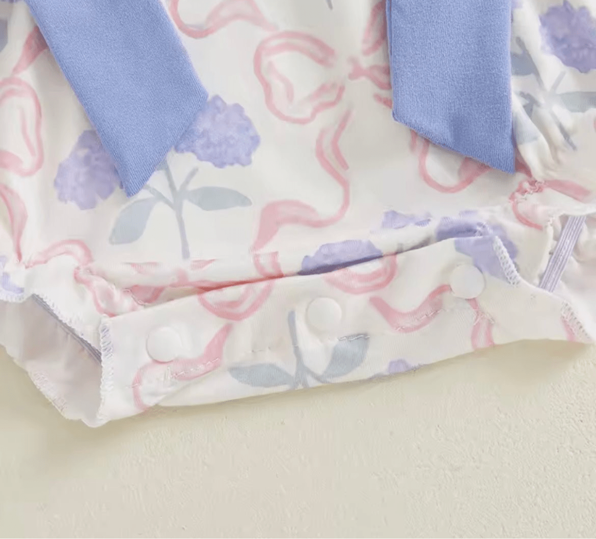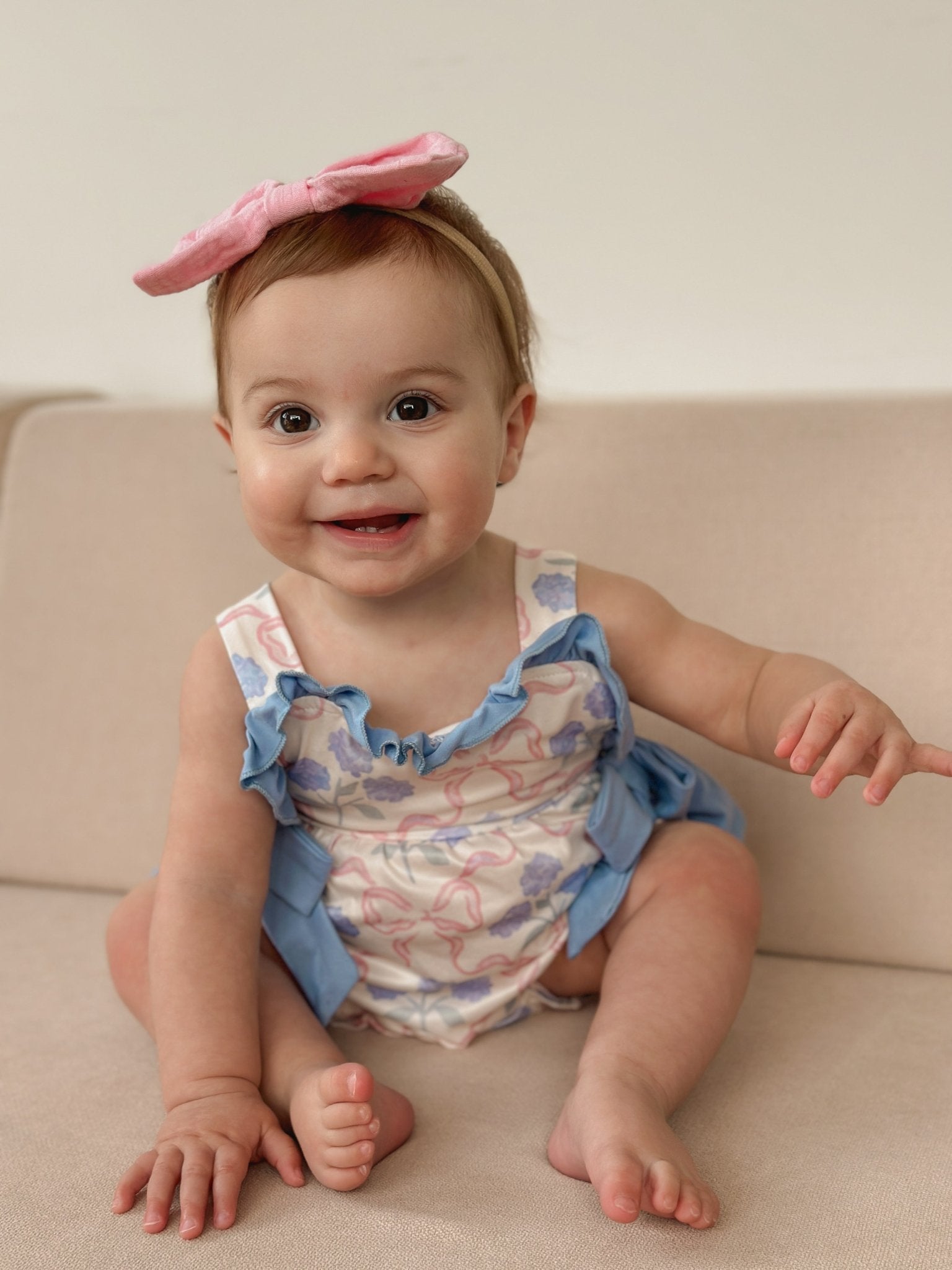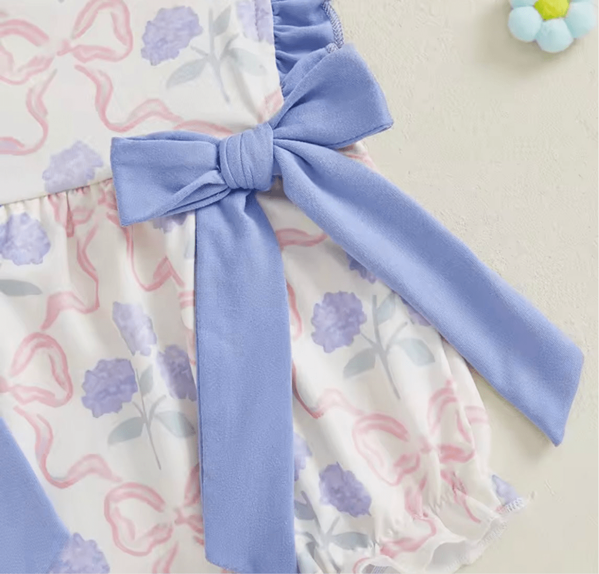 Special occasion soft jersey cotton fabric baby girl romper with the sweetest floral and pink bow detail on the fabric with 2 statement blue bows and blue frill detail and has 3 buttons at the bottom for easy nappy changes and 2 adjustable buttons to adjust for the best fit on the straps.