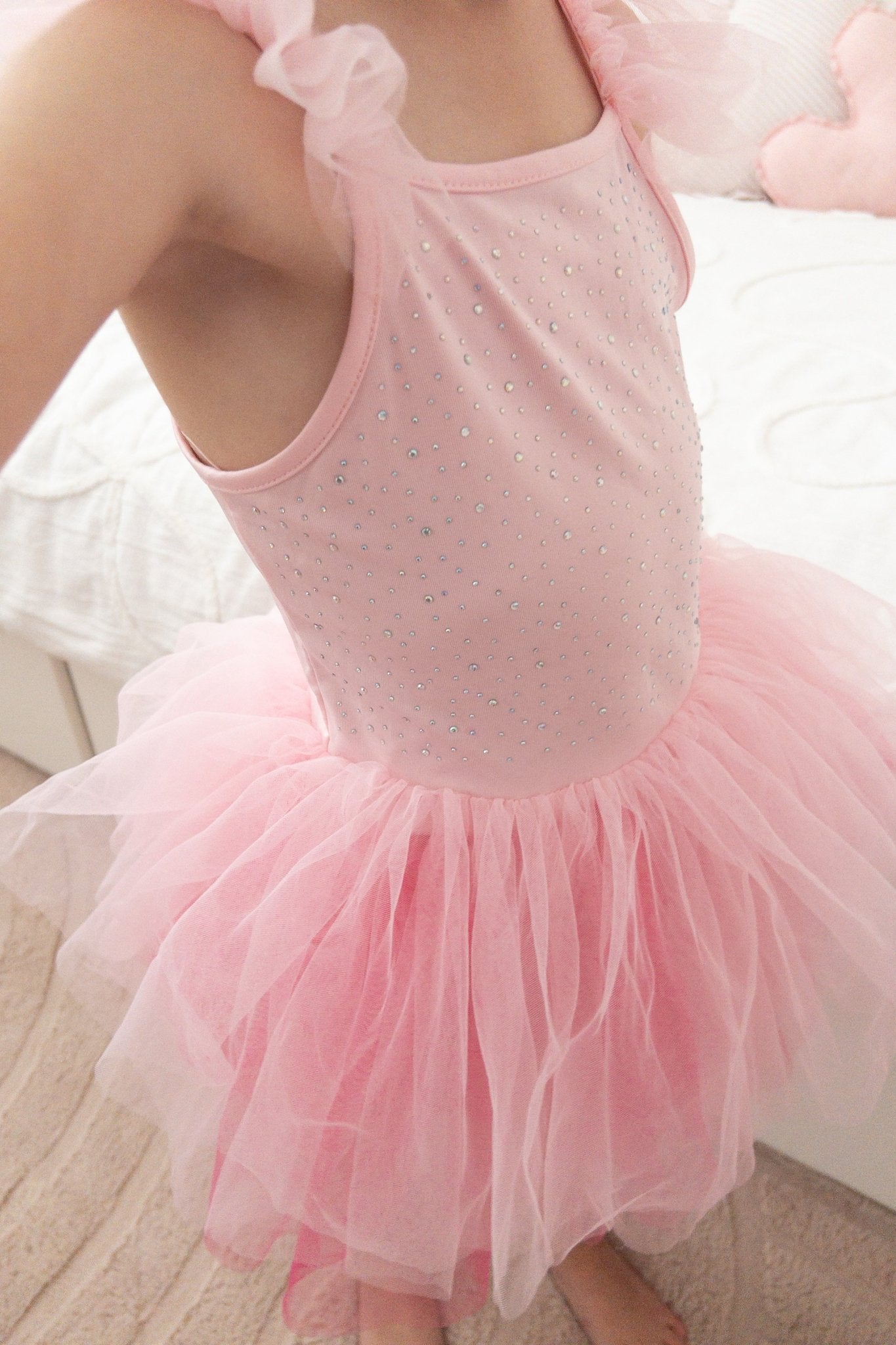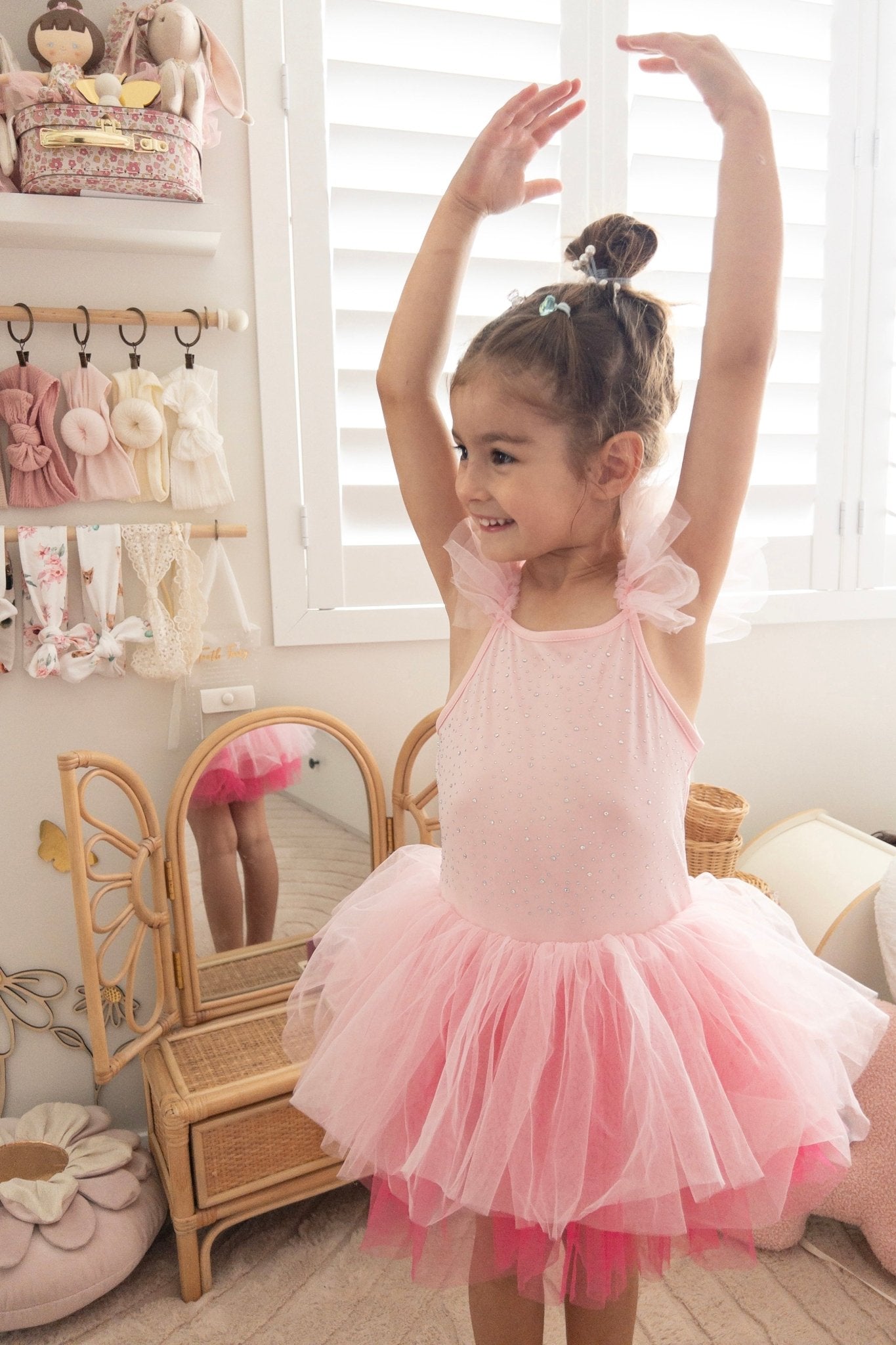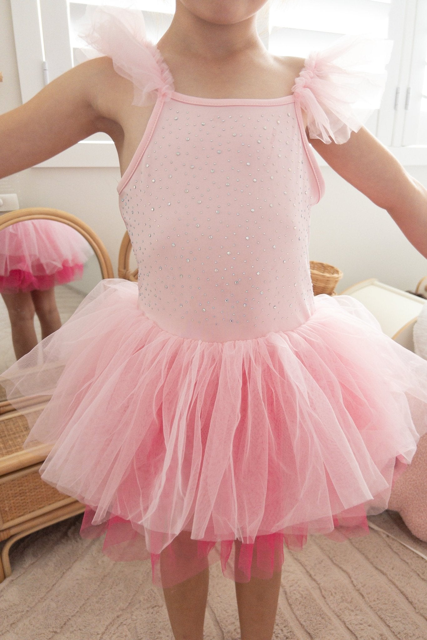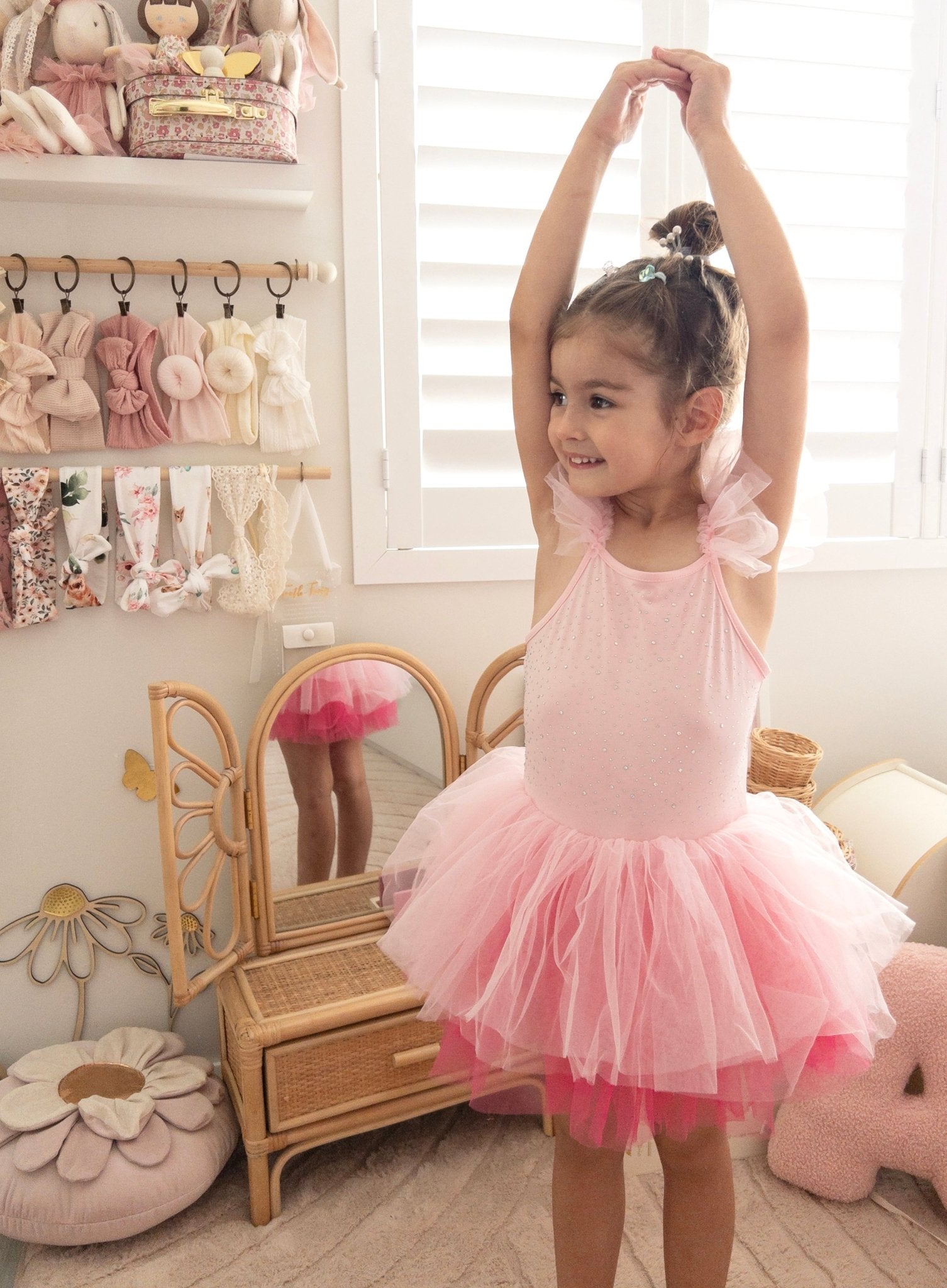 Gorgeous ballerina inspired tutu party romper with the the sweet baby pink bodysuit and baby pink tulle tutu with gold star sparkle detail its perfect for that ballerina ballet dance outfit or ballerina theme birthday party.