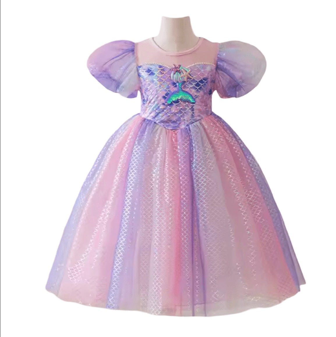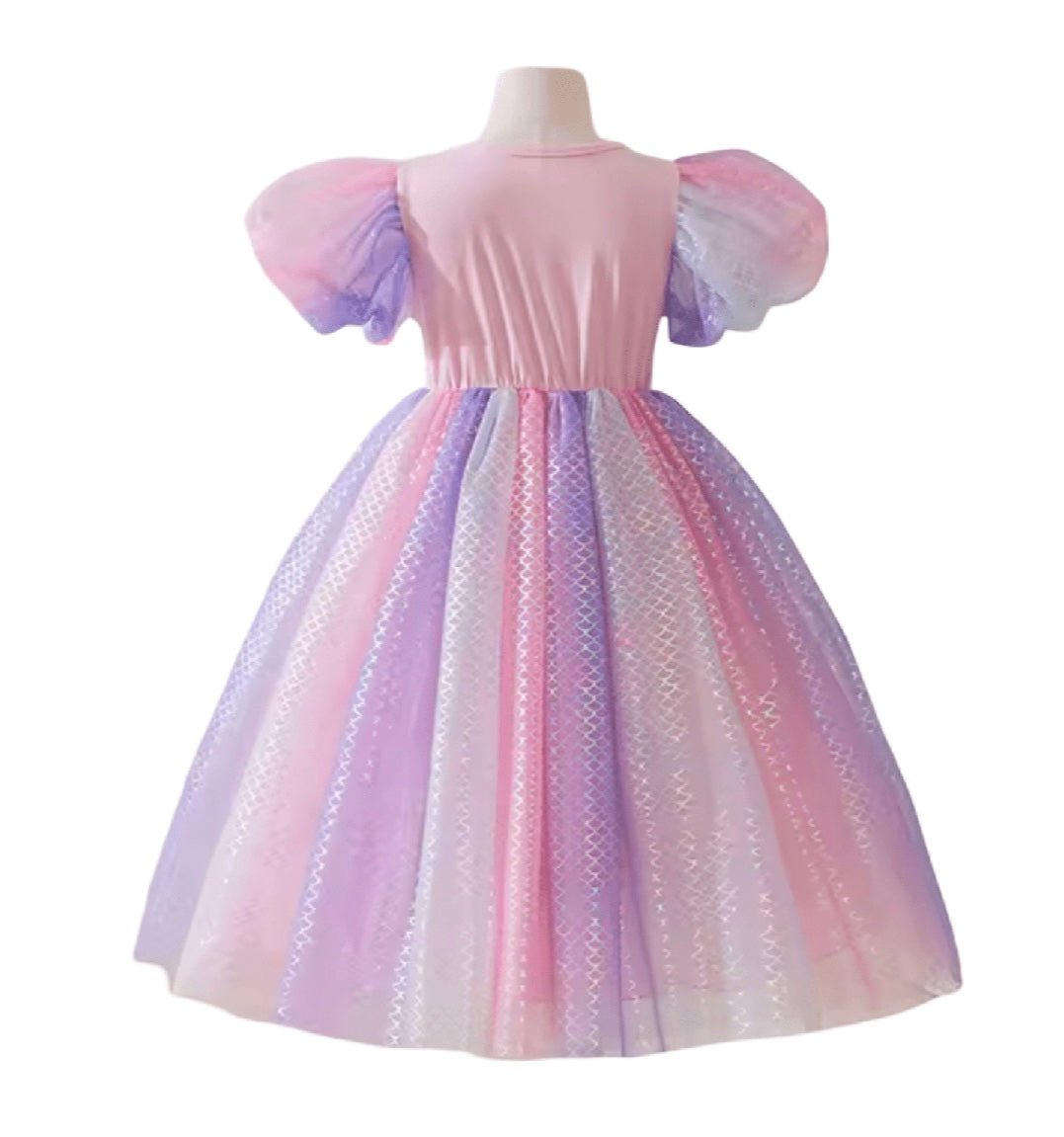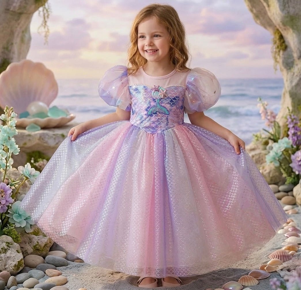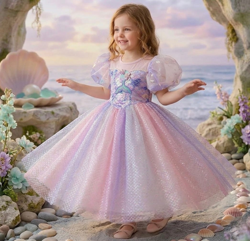 Gorgeous pink mermaid ariel princess theme birthday theme party dress is a beautiful unique dress with attachable purple sequins mermaid tail piece and a soft long sleeve fabric and the softest tulle dress.