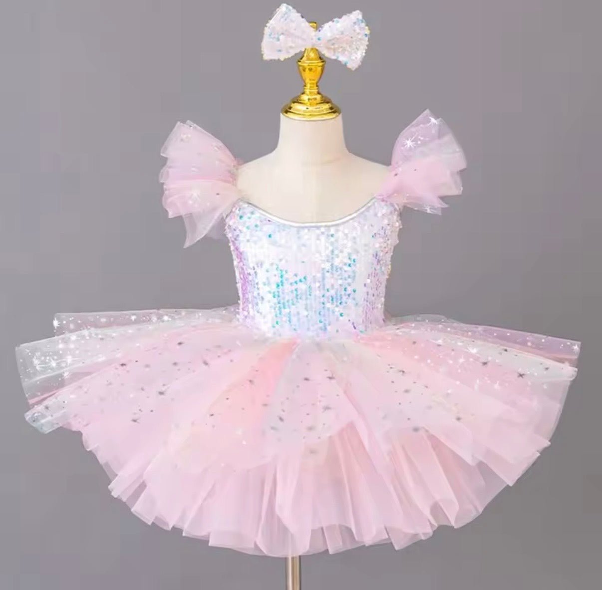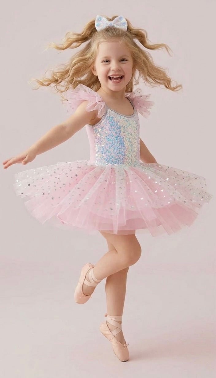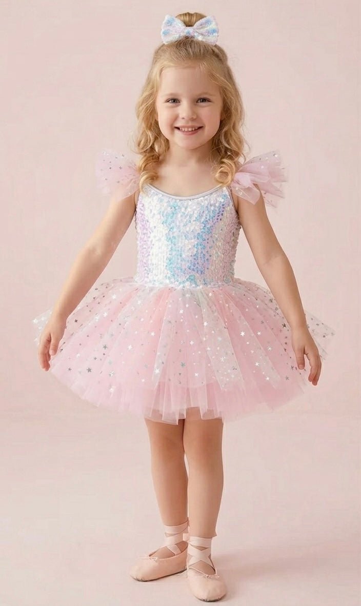 Our Ballerina Sparkle Luxe Tutu Dress is made for little girls who love to twirl, sparkle, and feel like a tiny princess. Featuring a shimmering pastel sequin bodice and a soft pink layered tutu skirt sprinkled with delicate star sparkle tulle, this dress is pure magic from every angle.