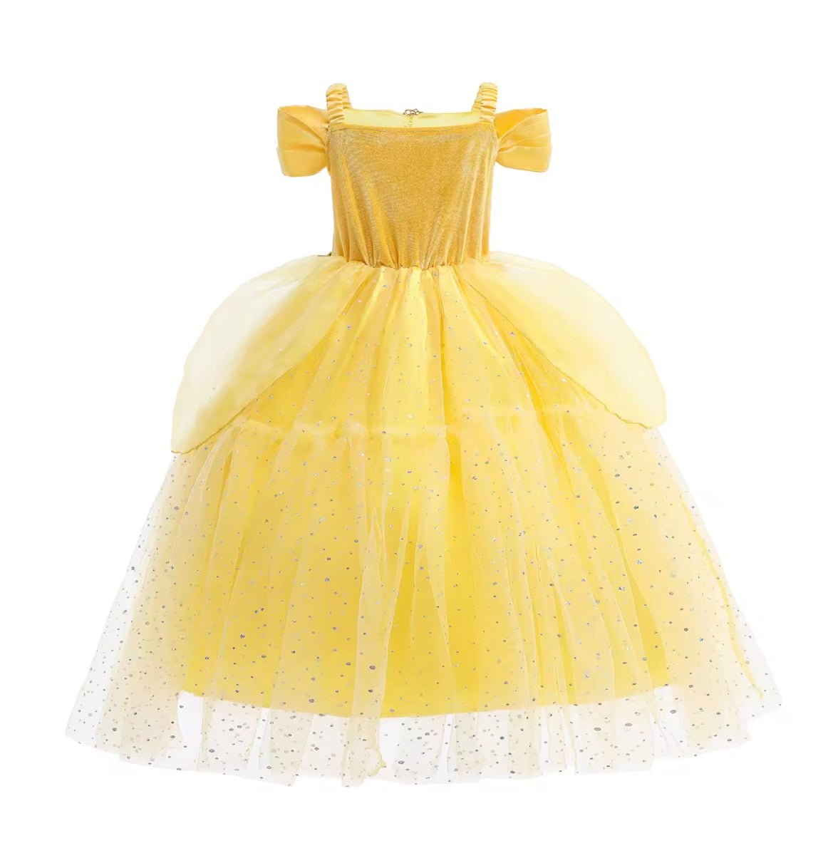 Gorgeous belle yellow style princess birthday theme party dress is a beautiful unique dress with sequin detail at the front and beaded gem piece attached to the dress.