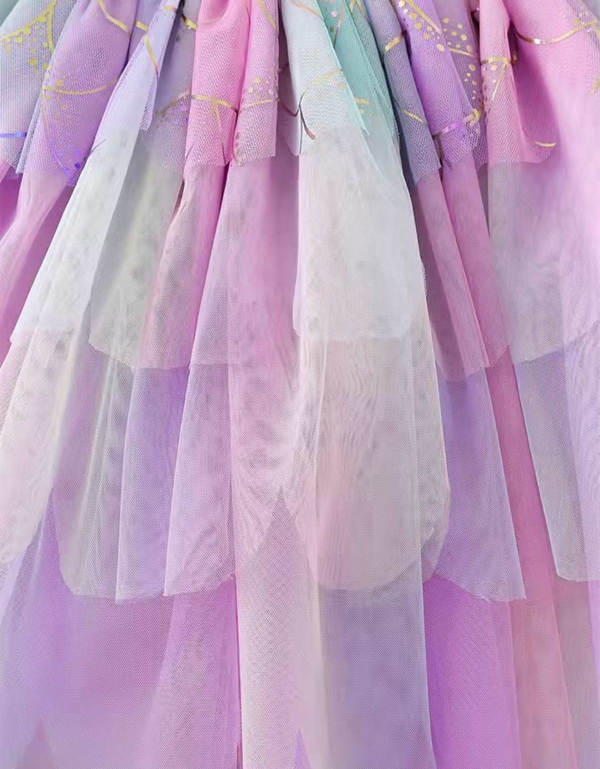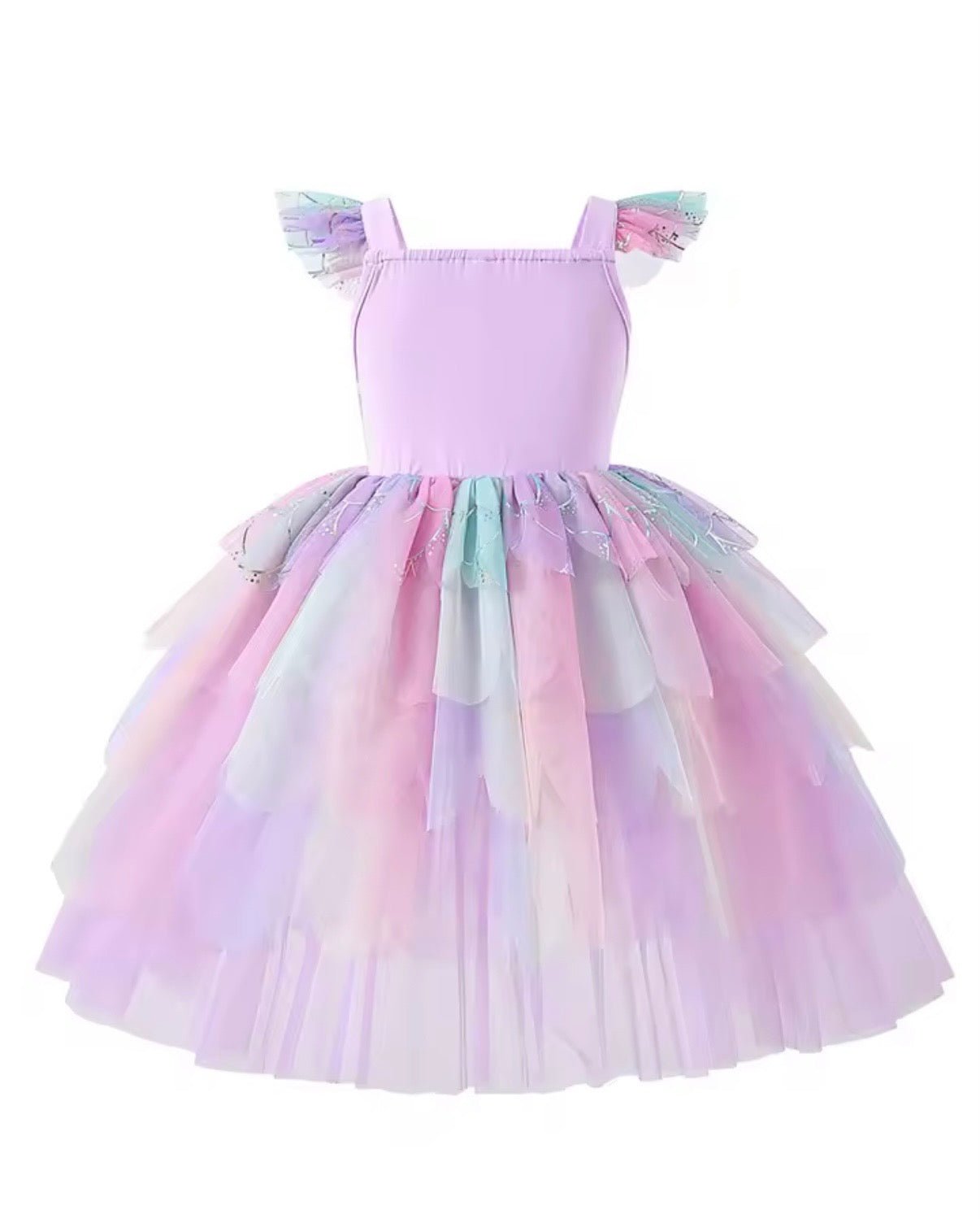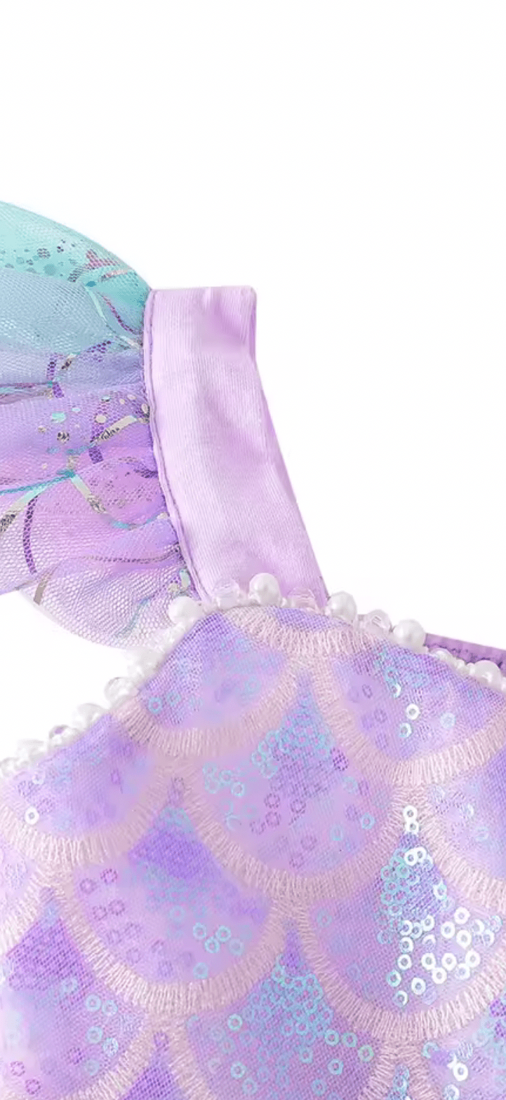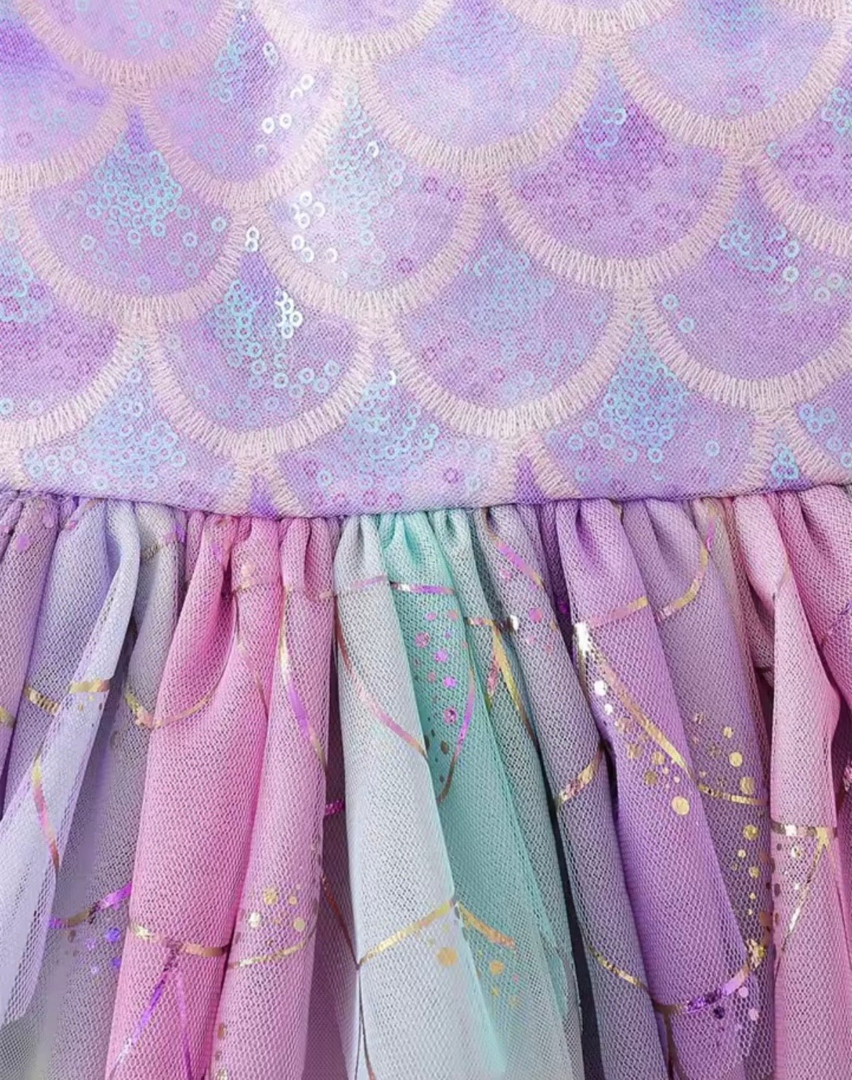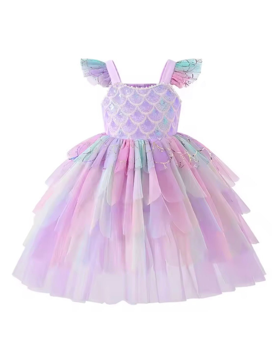 Designed for little girls who believe in mermaids, magic, and a little sparkle, this dress features a stunning iridescent mermaid-scale bodice that catches the light beautifully, paired with layers of dreamy rainbow tulle in soft fairyfloss shades of pink, lilac, and blue.