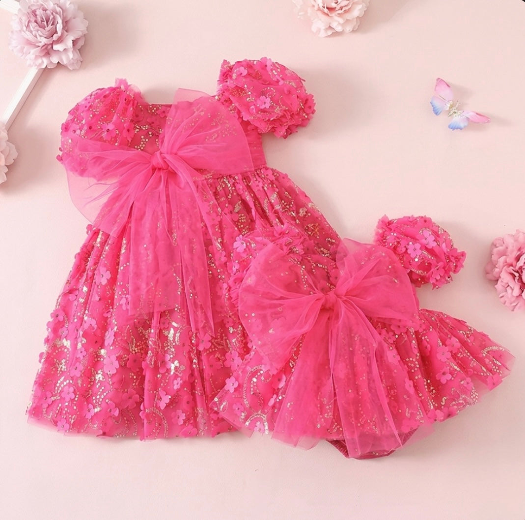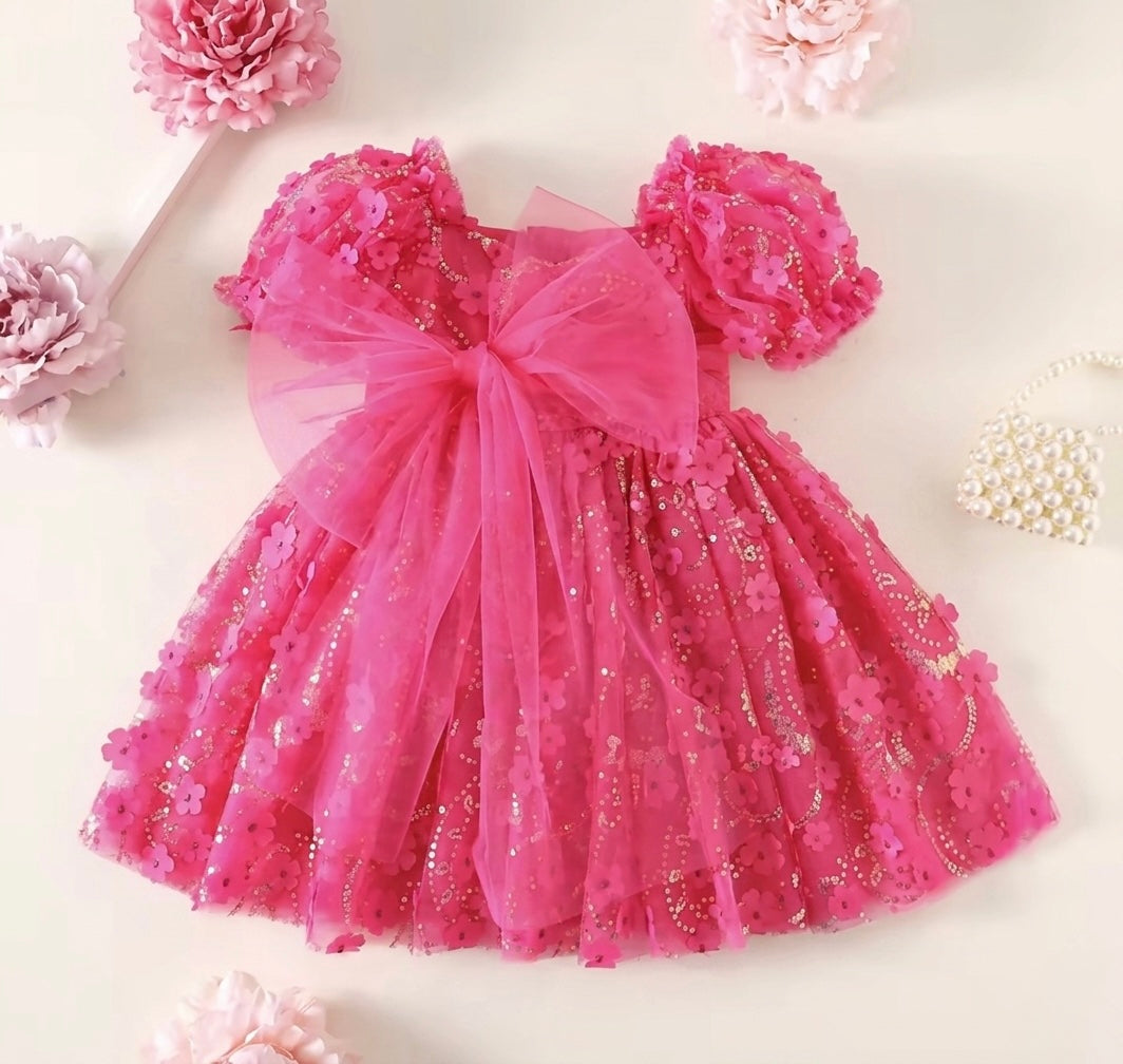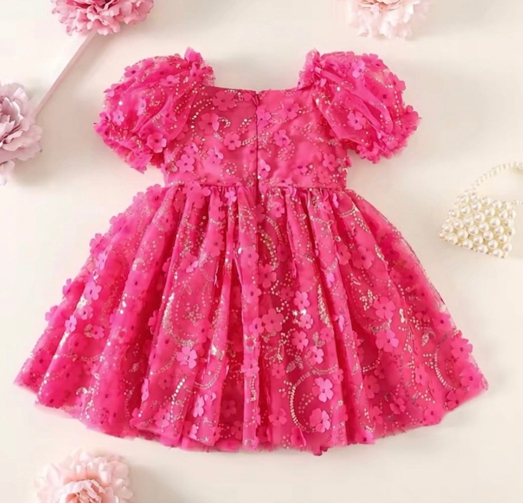 Gorgeous pink flower & sequins detail tulle & lace cotton dress with pink cotton under lining with a sweet little bow at the front this dress is the perfect statement piece for a fairy tea party theme garden party.