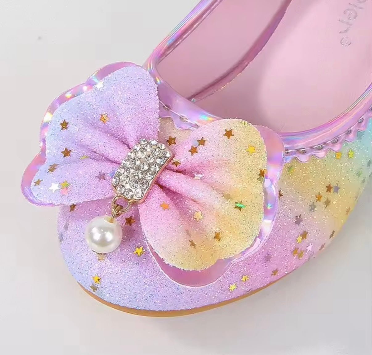 Each pair features a gentle, easy-to-walk-in low heel, a sparkling iridescent finish, and a statement butterfly bow topped with a dainty pearl and shimmering gem detail.