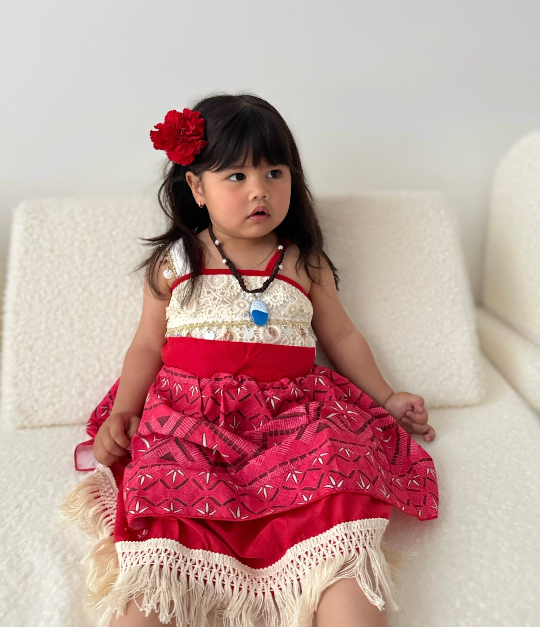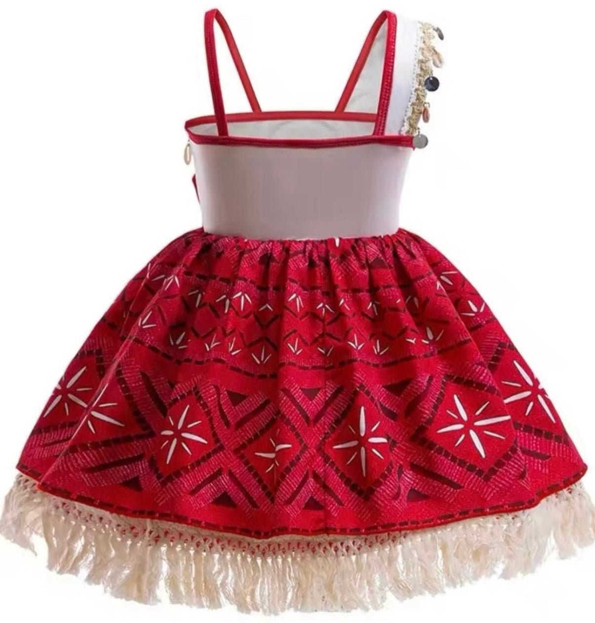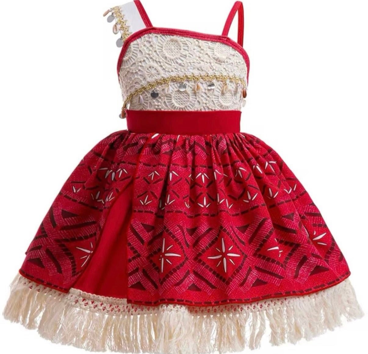 Bring island magic to her special day with our gorgeous Moana inspired princess dress. This unique design features fringe detailing, delicate lace accents, and a bold red patterned skirt that captures the adventurous spirit of Moana.