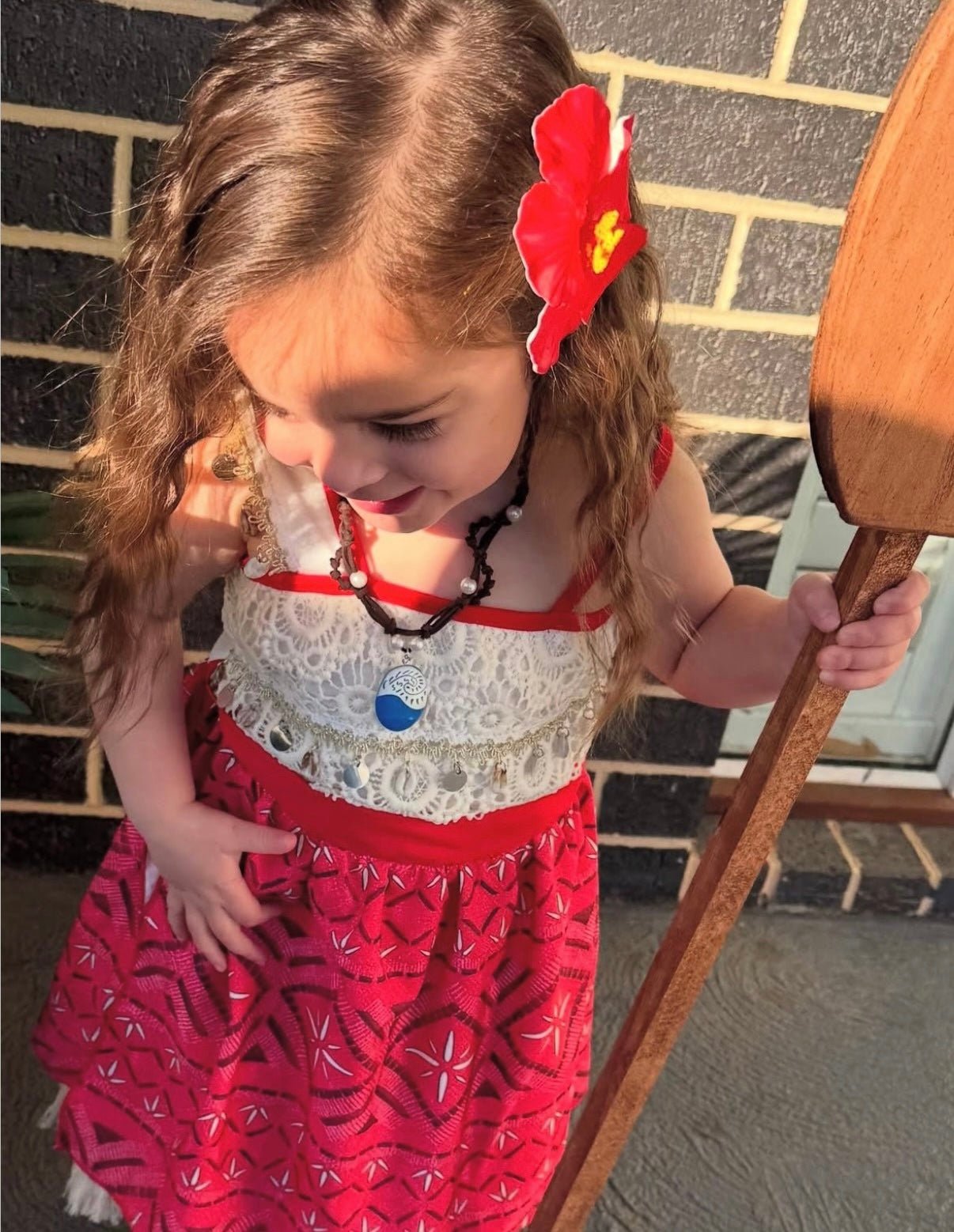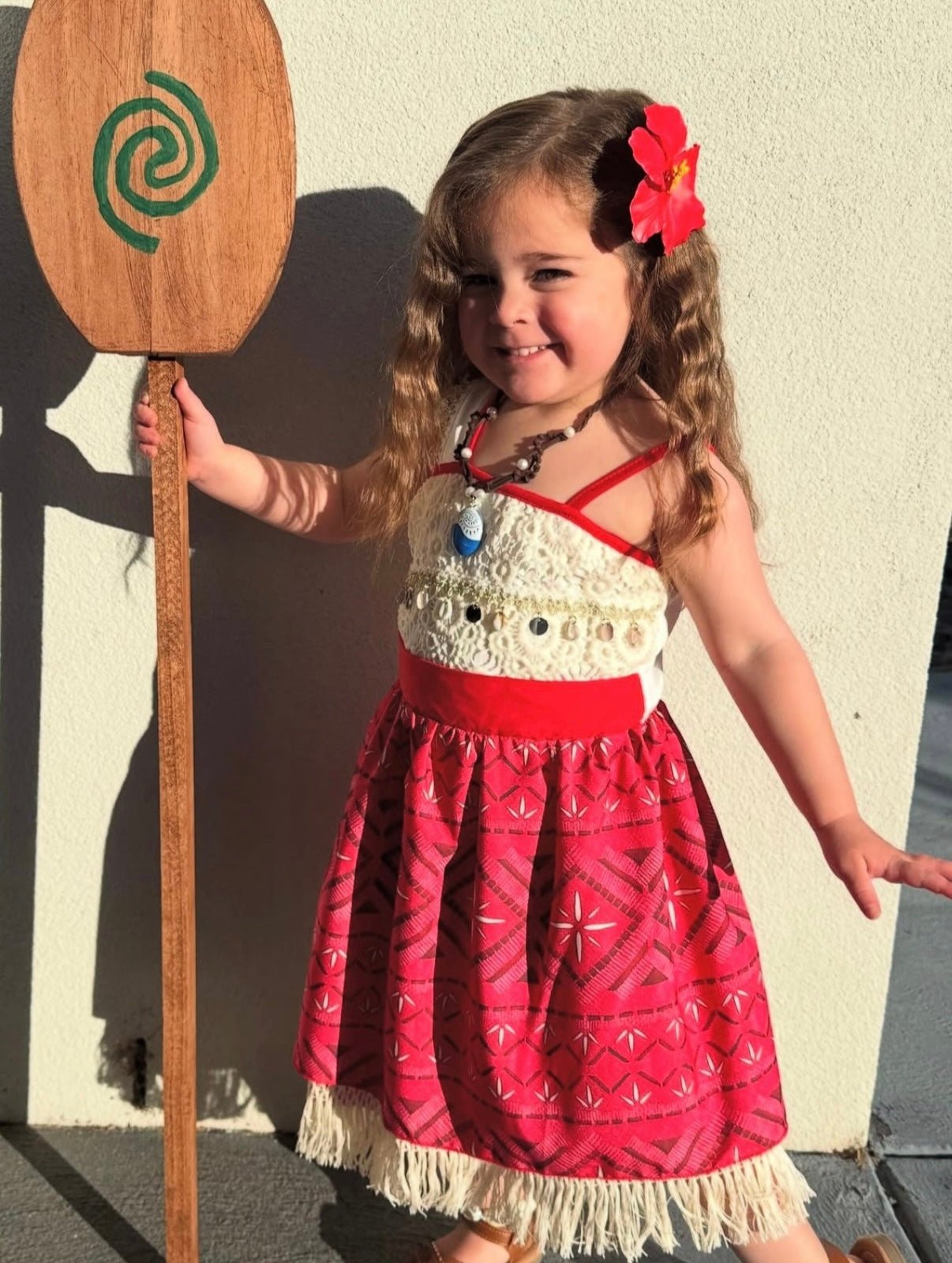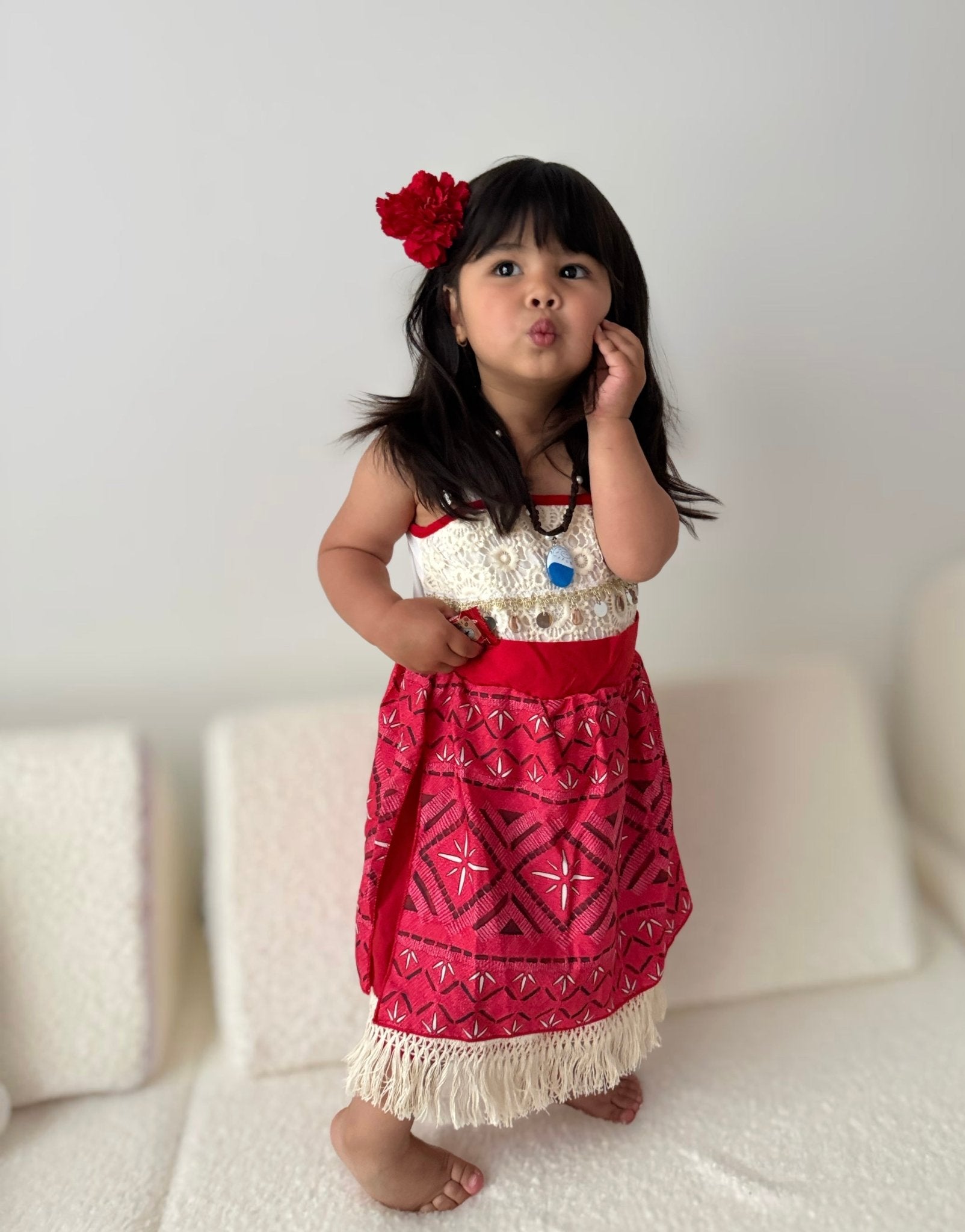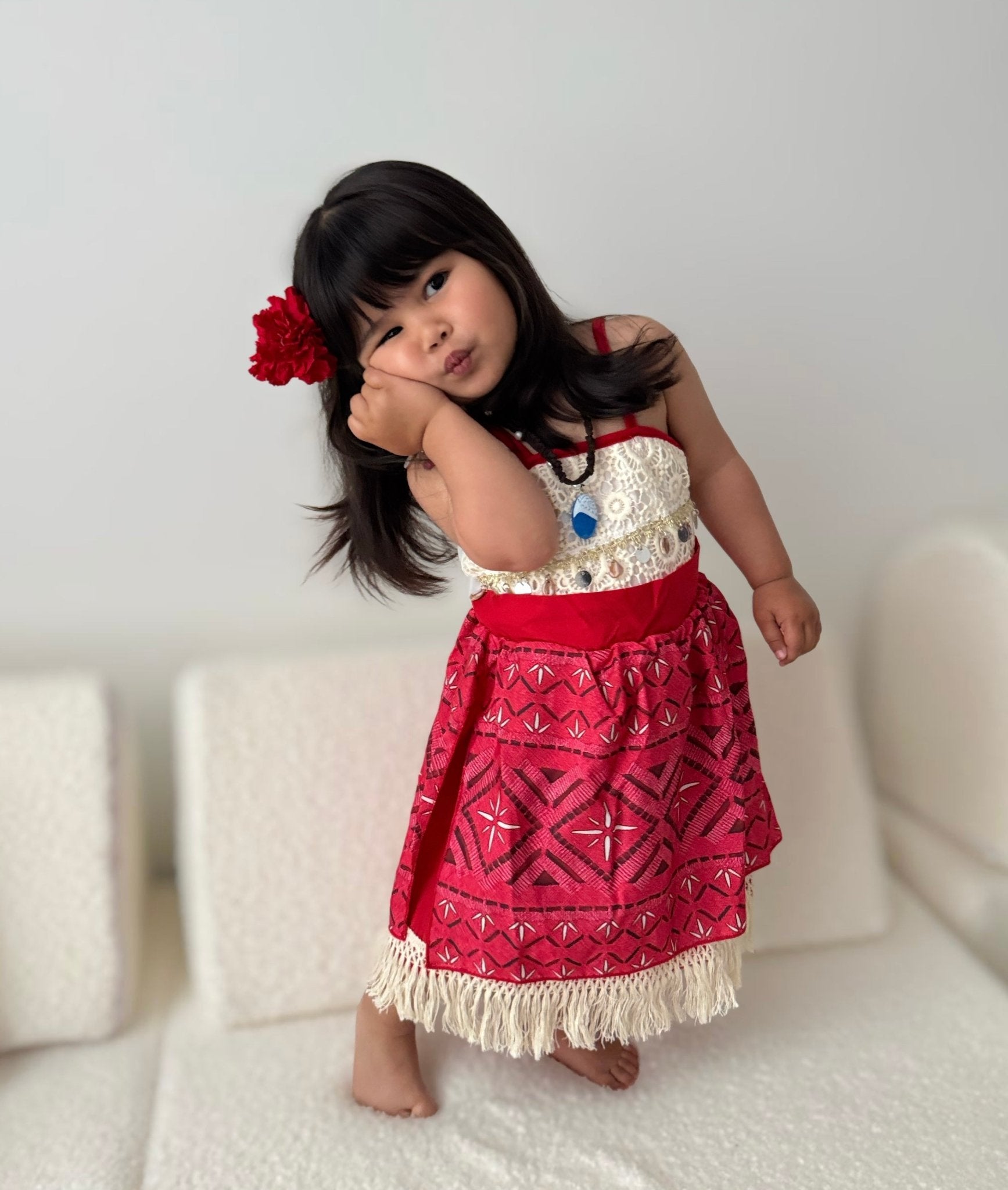 Bring island magic to her special day with our gorgeous Moana inspired princess dress. This unique design features fringe detailing, delicate lace accents, and a bold red patterned skirt that captures the adventurous spirit of Moana.