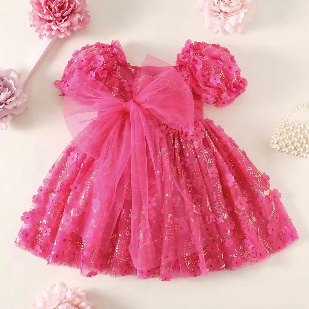 Special occasion baby pink cotton muslin fabric frill tutu romper with the sweetest little pink bow details all over the romper. It has 2 buttons at the back to do up and 3 snap buttons at the bottom of the romper for easy nappy changes.