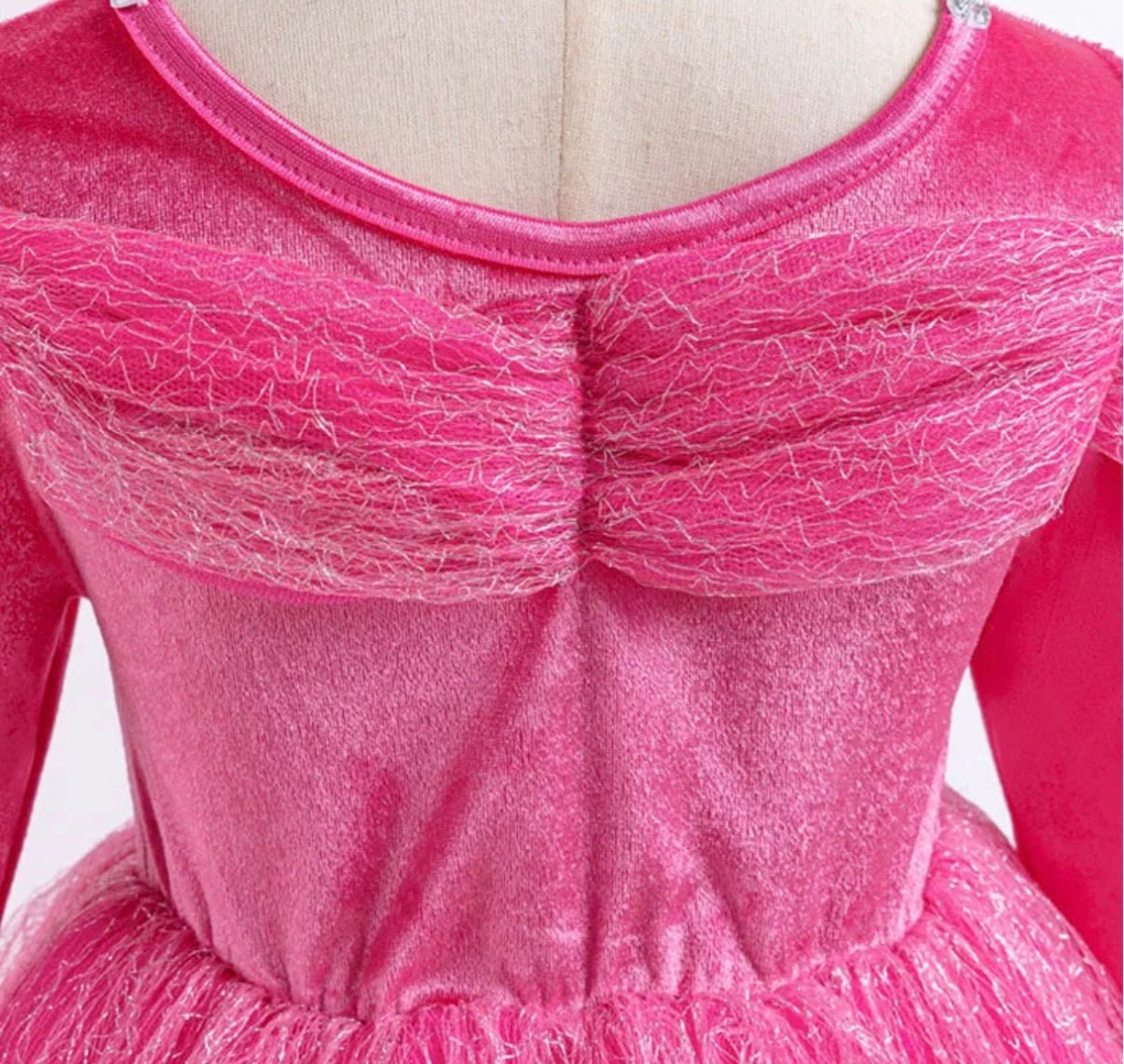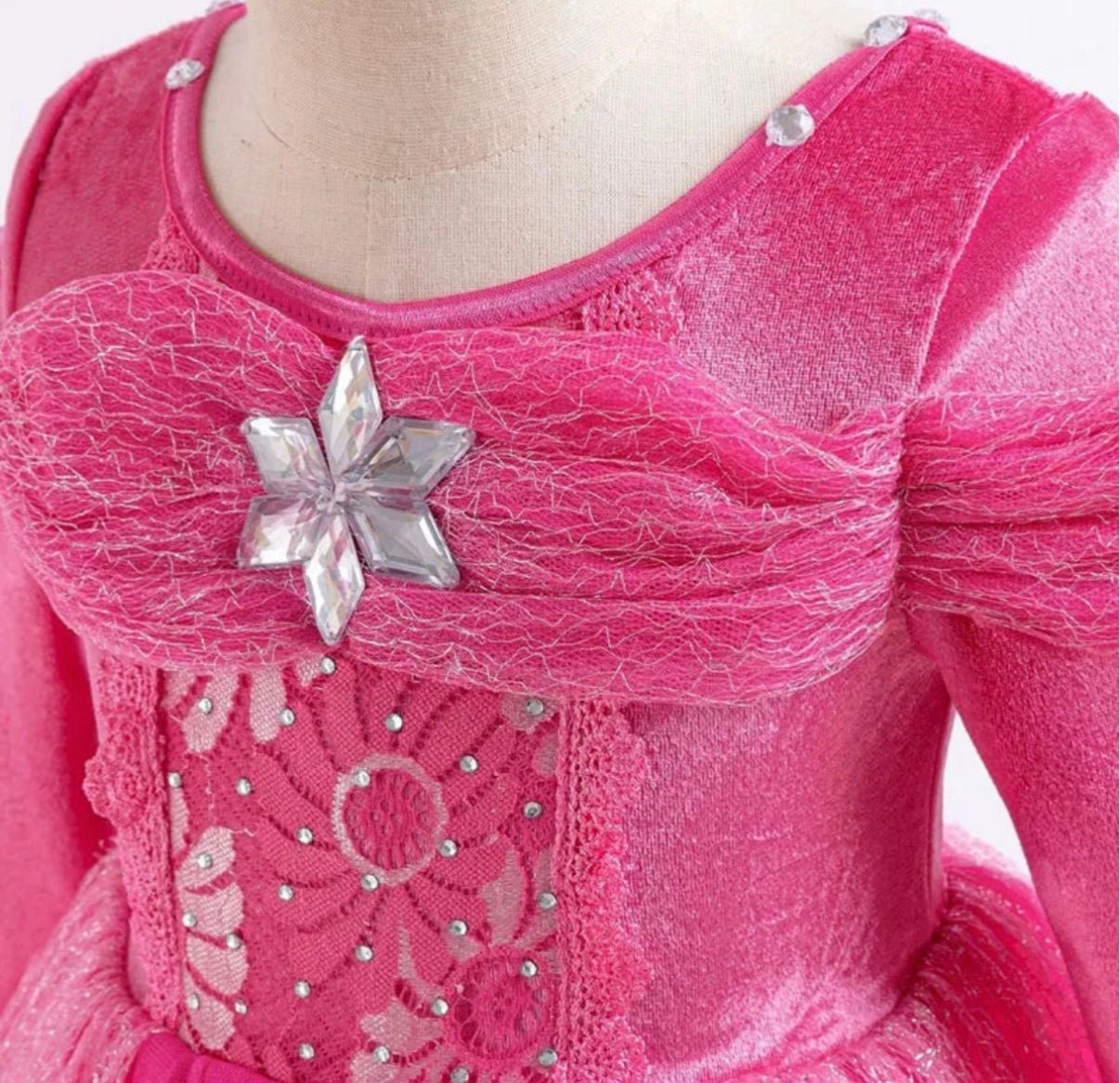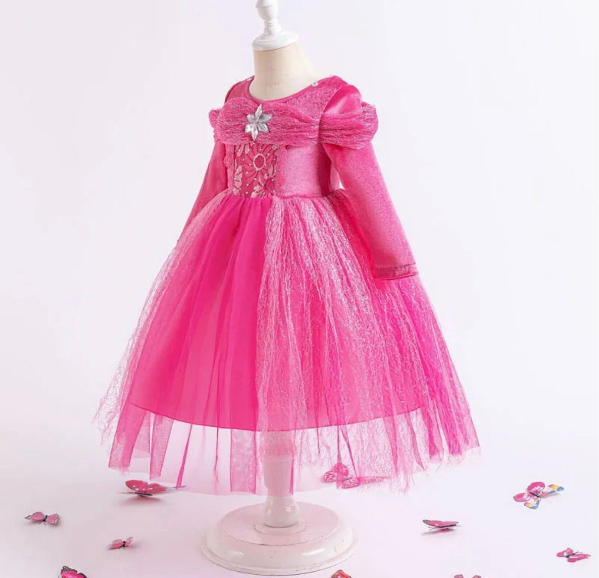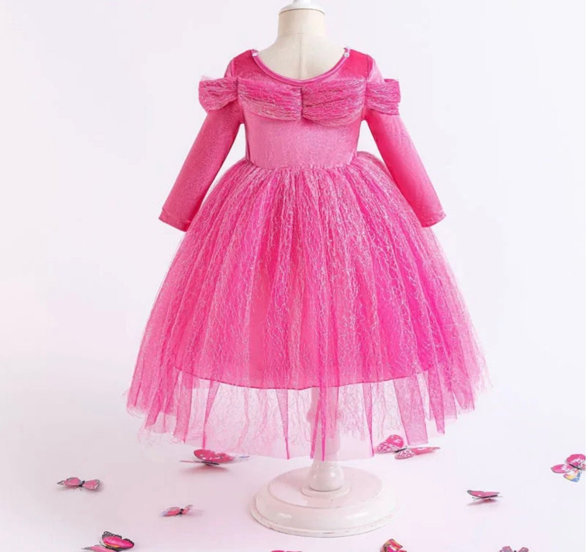Gorgeous pretty in pink long sleeve velvet aurora style princess birthday theme party dress is a beautiful unique dress with gem detail at the front and tulle sleeve detail with a soft pink velvet stretch fabric on the top part with a tulle overlay and has butterfly to clip on yourself and place where you would like them to go.