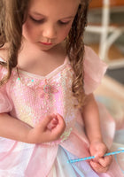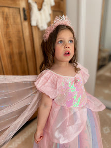 Gorgeous inspired aurora fairy princess style princess birthday theme party dress is a beautiful unique dress with sequin detail at the front and beaded gem piece attached to the dress or can come off with a tulle overlay with cape to match the cape can come off.