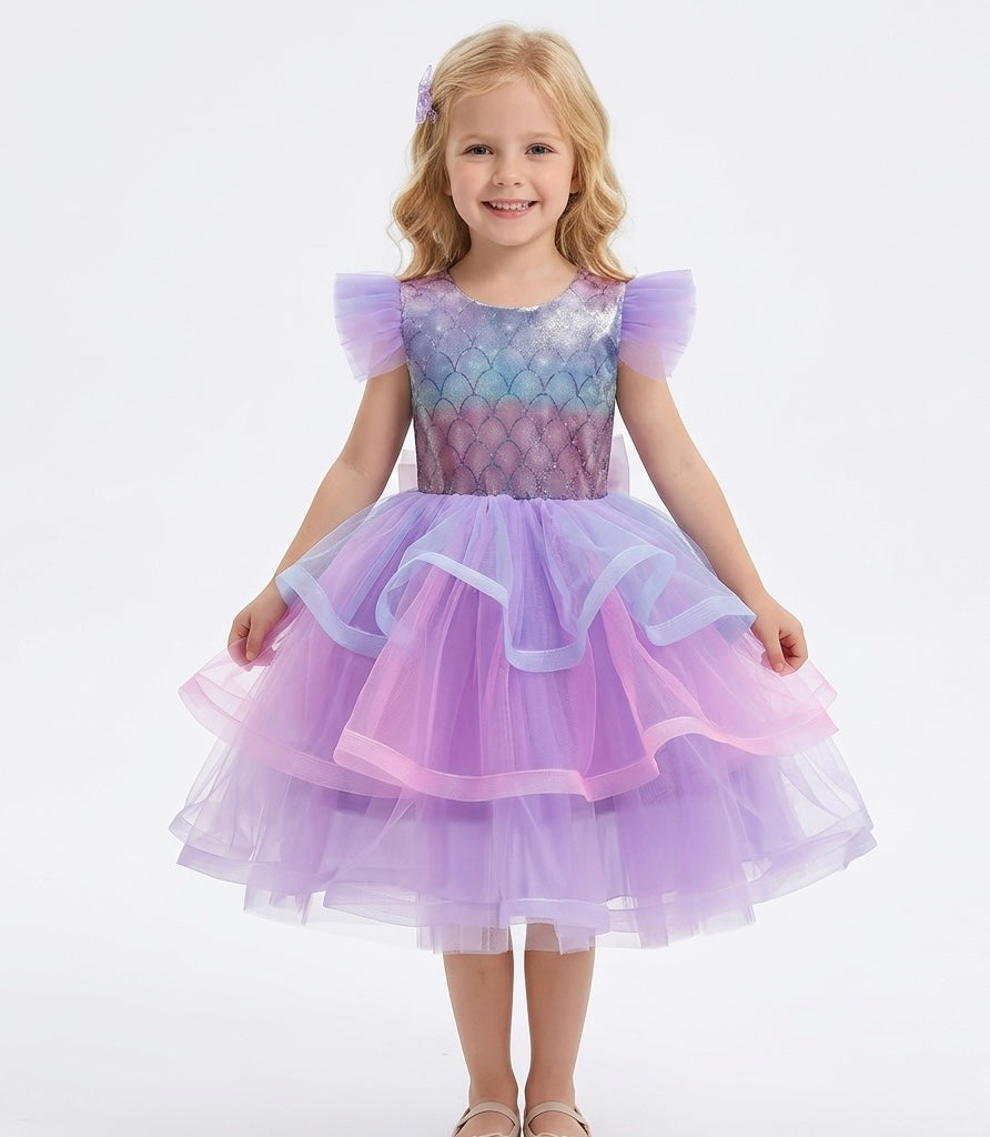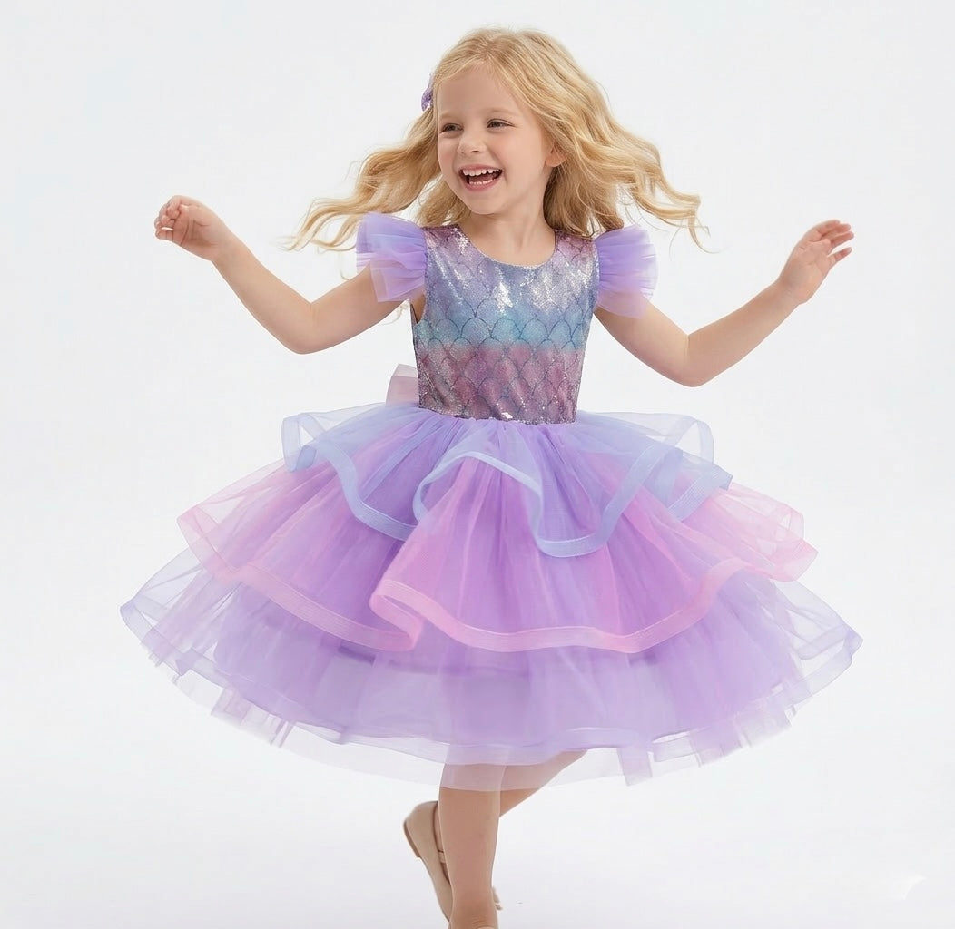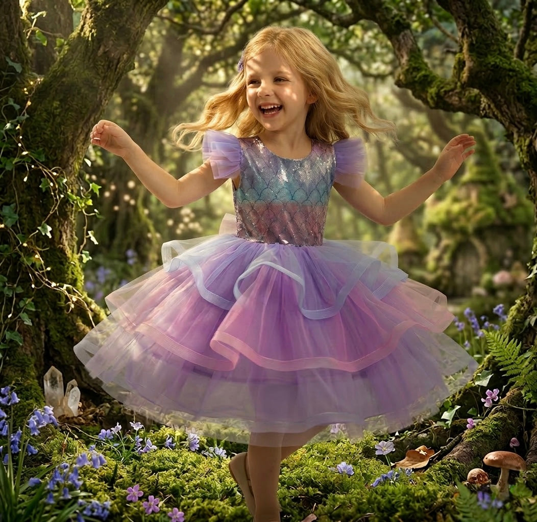 Make her feel like she’s stepped straight out of a fairytale with our Seraphina Mermaid Princess Tulle Dress a magical piece designed for the little girls who love sparkle, twirling, and princess adventures.
